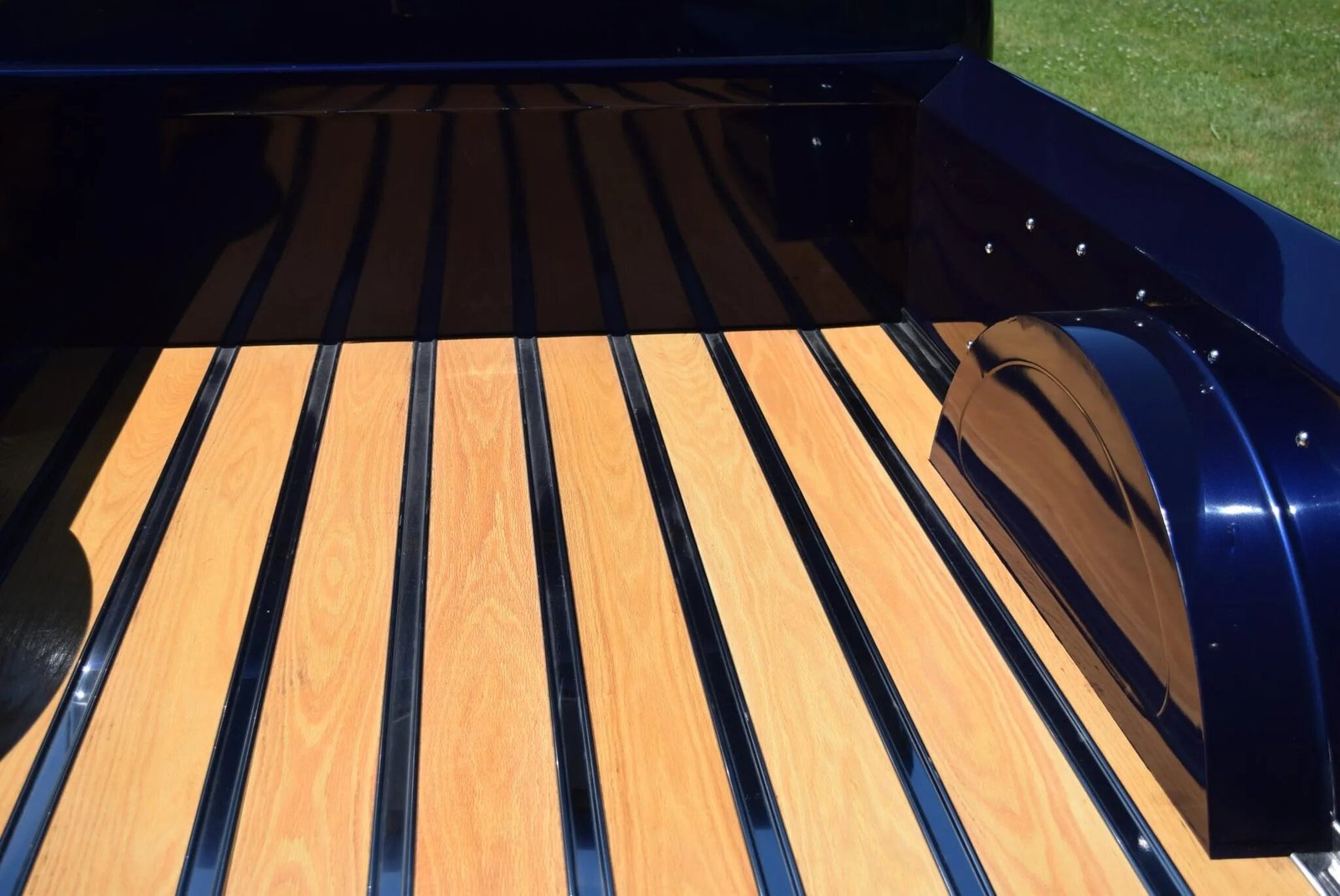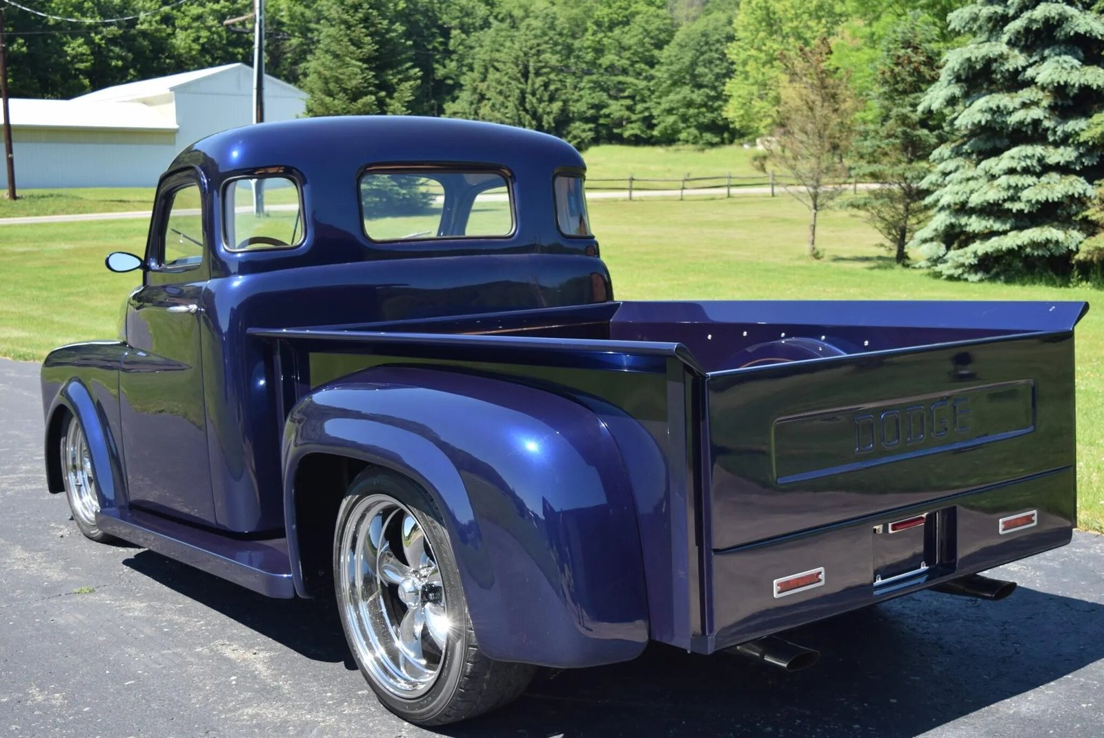 Features include a wood-lined bed, fixed tailgate, recessed license plate surround, flush-mount taillights, a split windshield, cab rear quarter windows, side mirrors, and a dual exhaust system with chrome finishers.