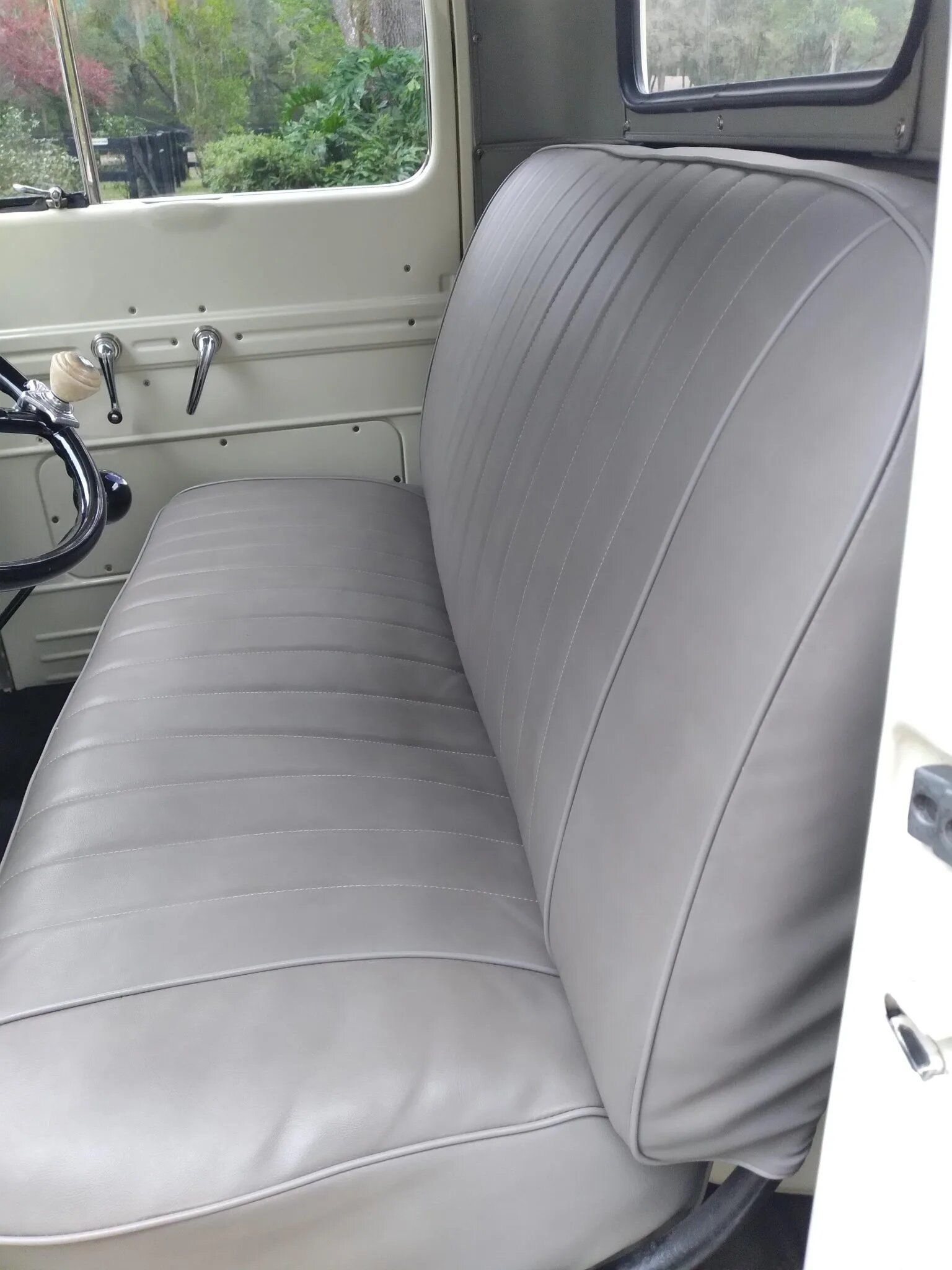 The cab features a custom gray leather bench seat, body-color sheet metal, rubber floor mats, and a gray headliner with an aftermarket dome light.