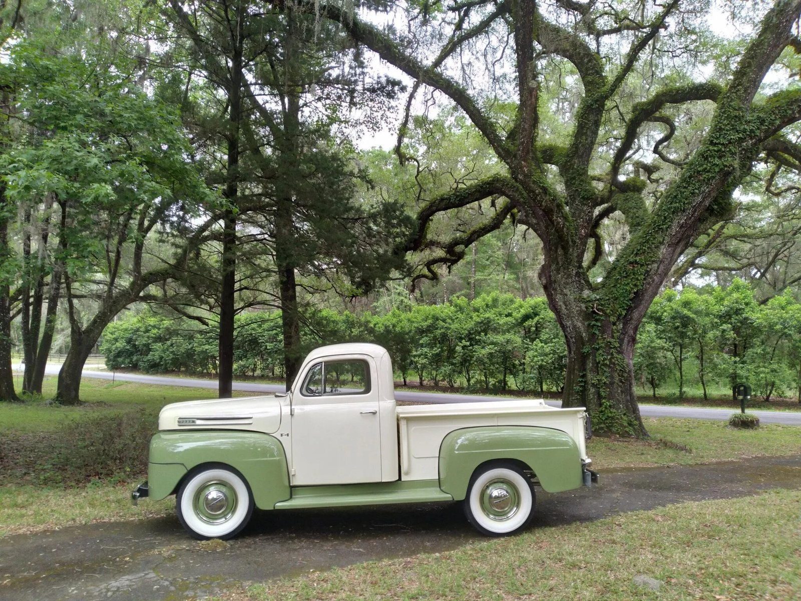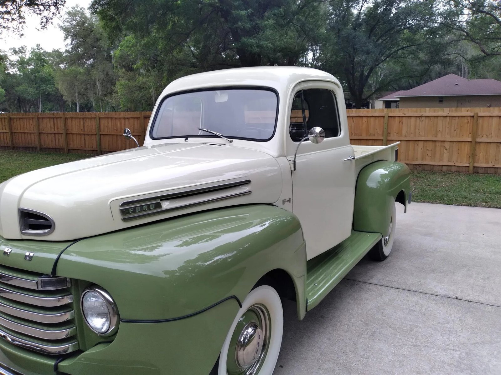 The truck has been refinished in green and white, and power is provided by a 239ci flathead V8 paired with a three-speed manual transmission.