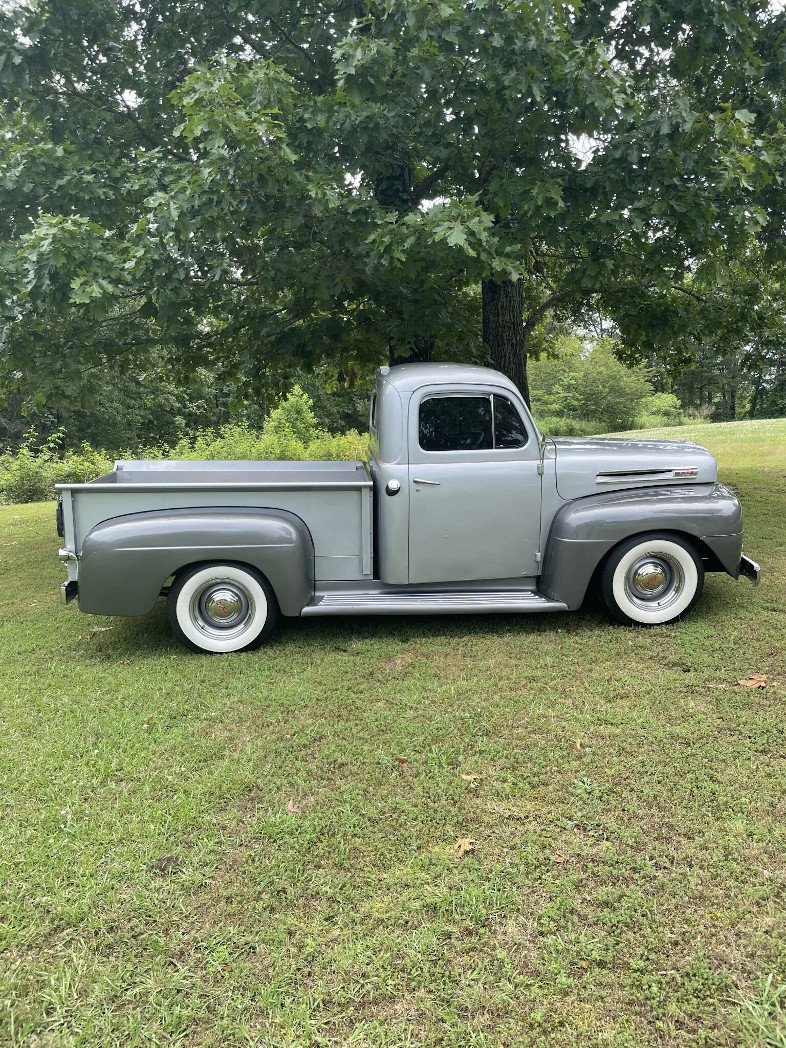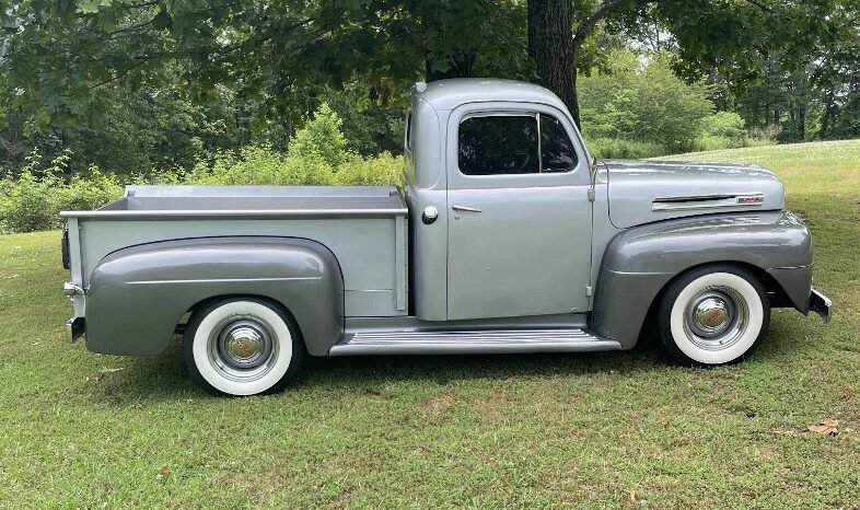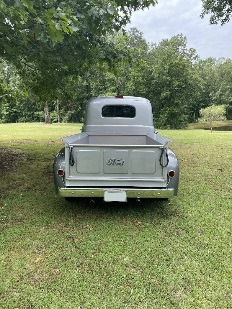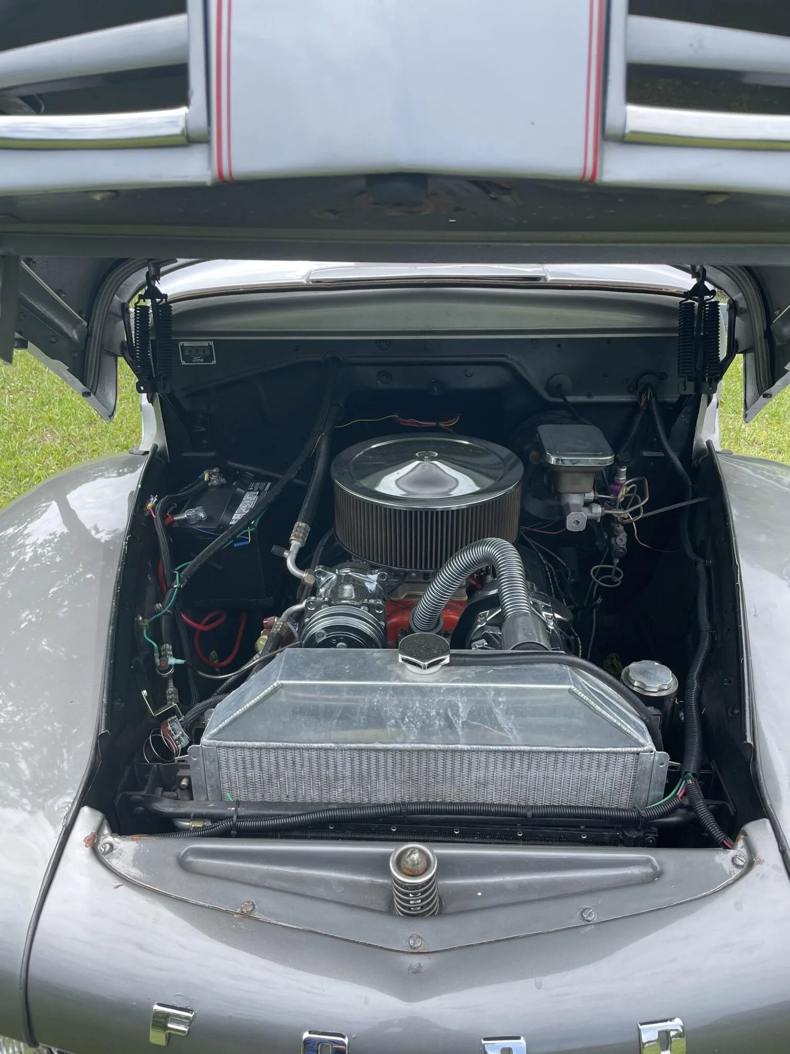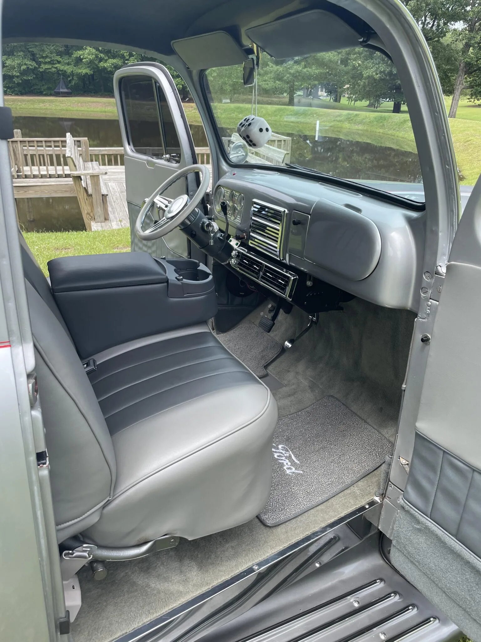 The truck has been refinished in two-tone gray and silver over matching leather, and power is supplied by a 350ci General Motors V8 paired with a three-speed automatic transmission.