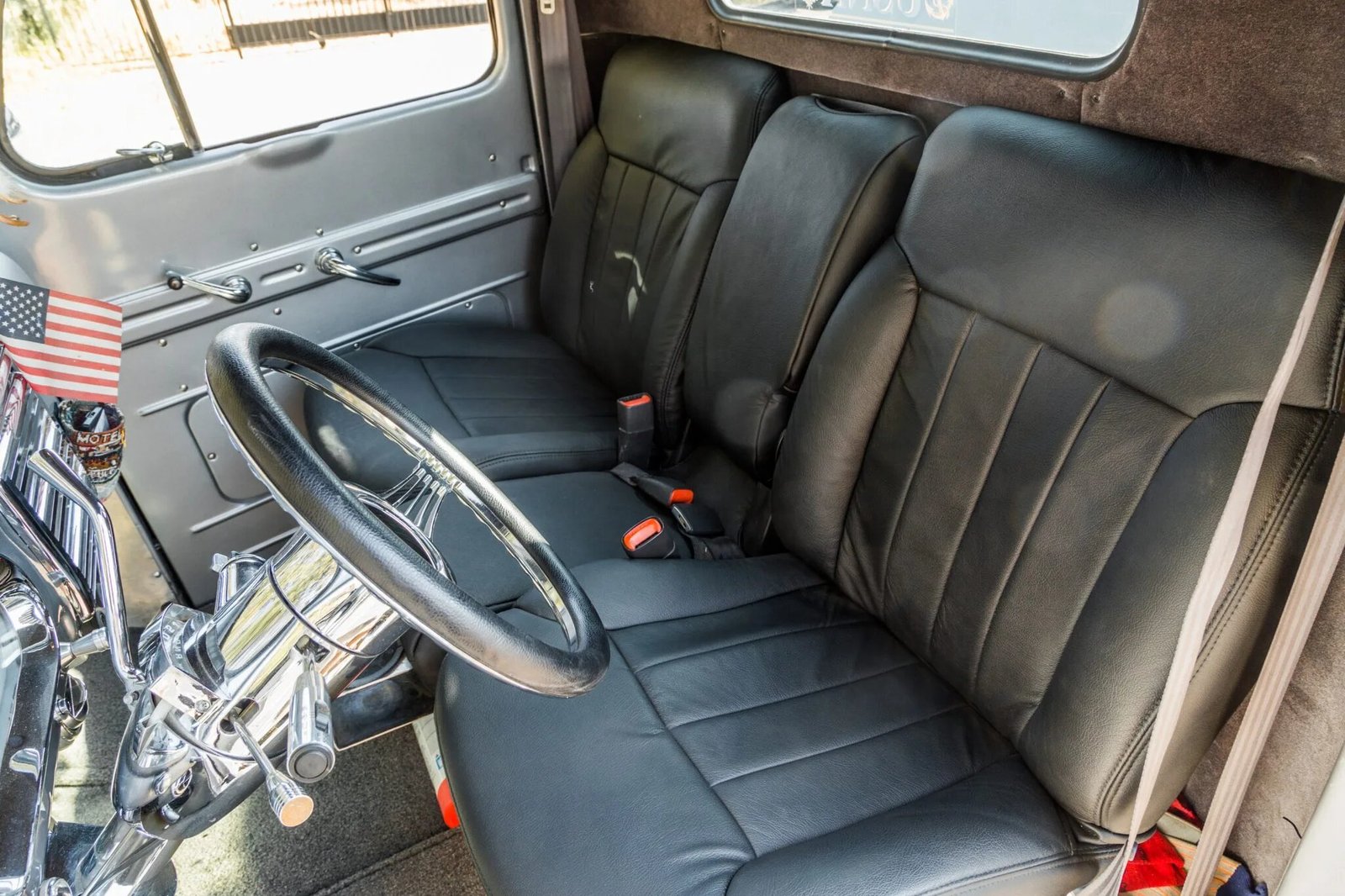 The interior features a replacement adjustable bench seat with black leather upholstery and three-point driver and passenger seatbelts and a center lap belt.