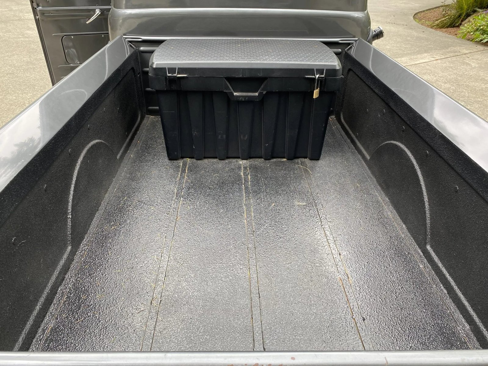A spray-on liner has been applied to the bed, which also contains a storage chest.