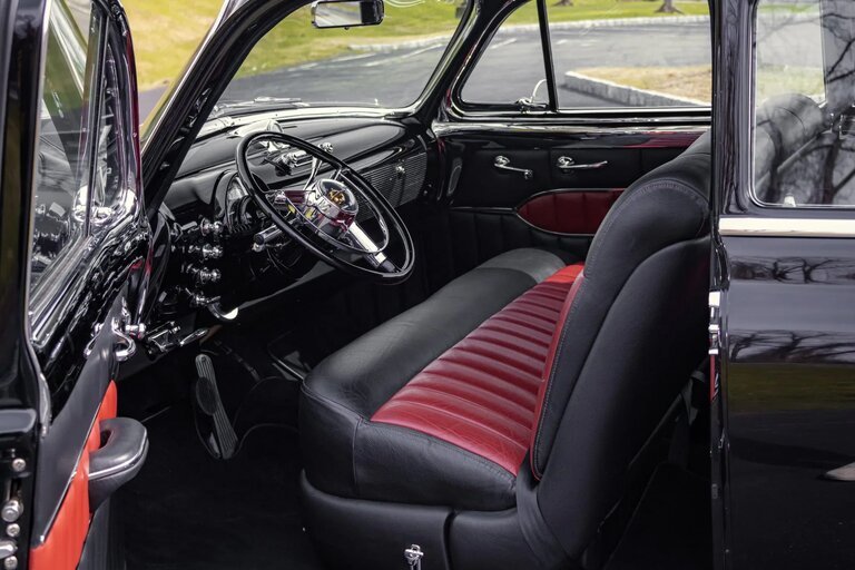 The interior was redone by Howdy Ledbetter using black leather upholstery with red accents covering the front and rear bench seats, which are accompanied by matching treatments for the door panels and rear trim.