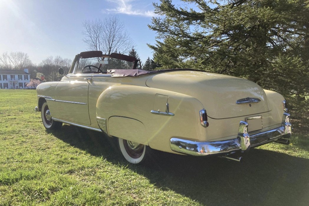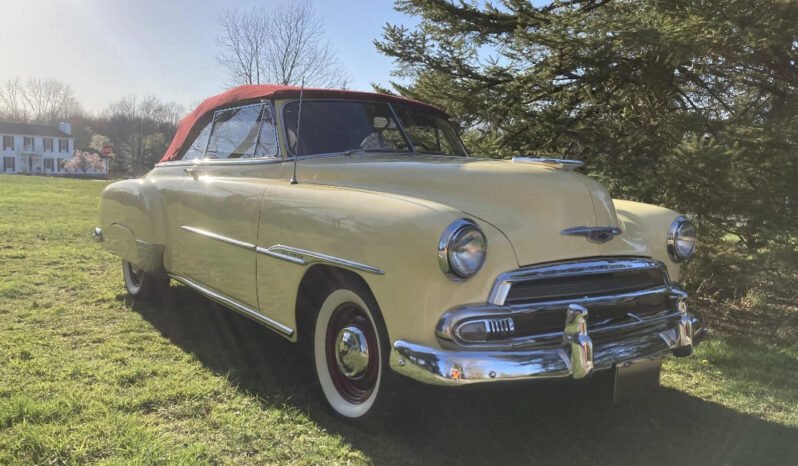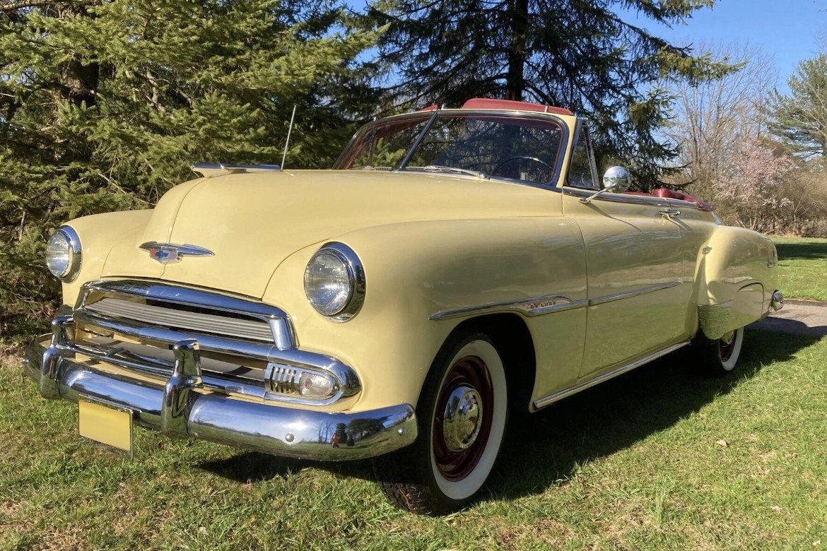 This 1951 Chevrolet Styleline Deluxe convertible coupe is finished in cream yellow over red synthetic leather and is powered by a replacement 216ci inline-six paired with a column-shifted three-speed manual transmission.