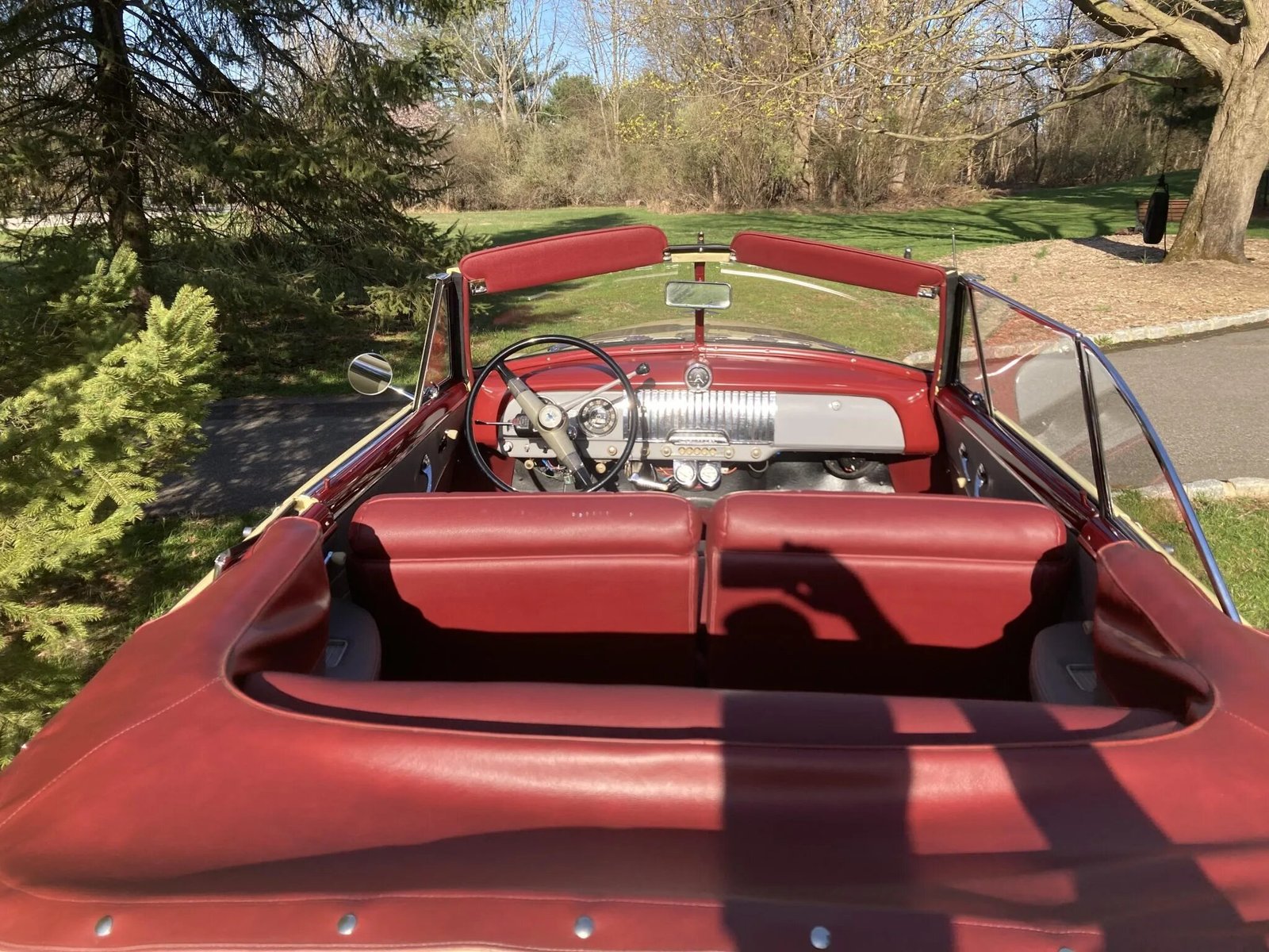 The red-finished 15″ steel wheels wear refinished chrome hubcaps and are wrapped in BFGoodrich Silvertown whitewall tires.