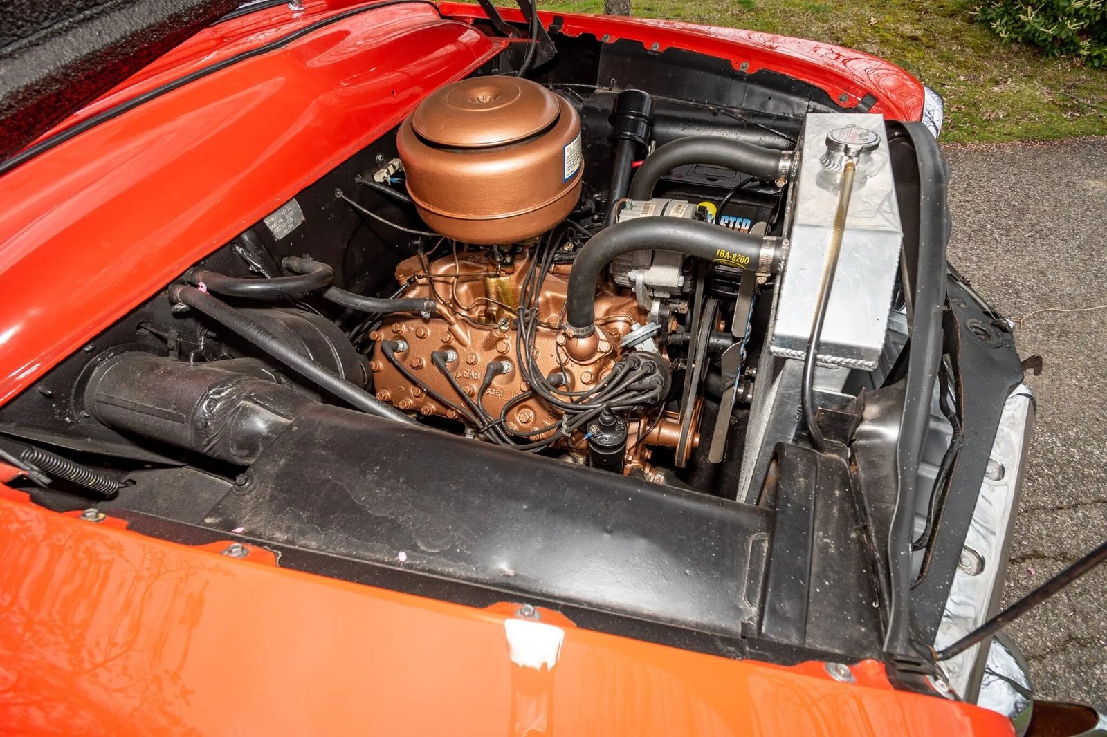 The 239ci flathead V8 features a single downdraft carburetor with an oil bath air cleaner and was rebuilt by Extreme Motorports Engineering.