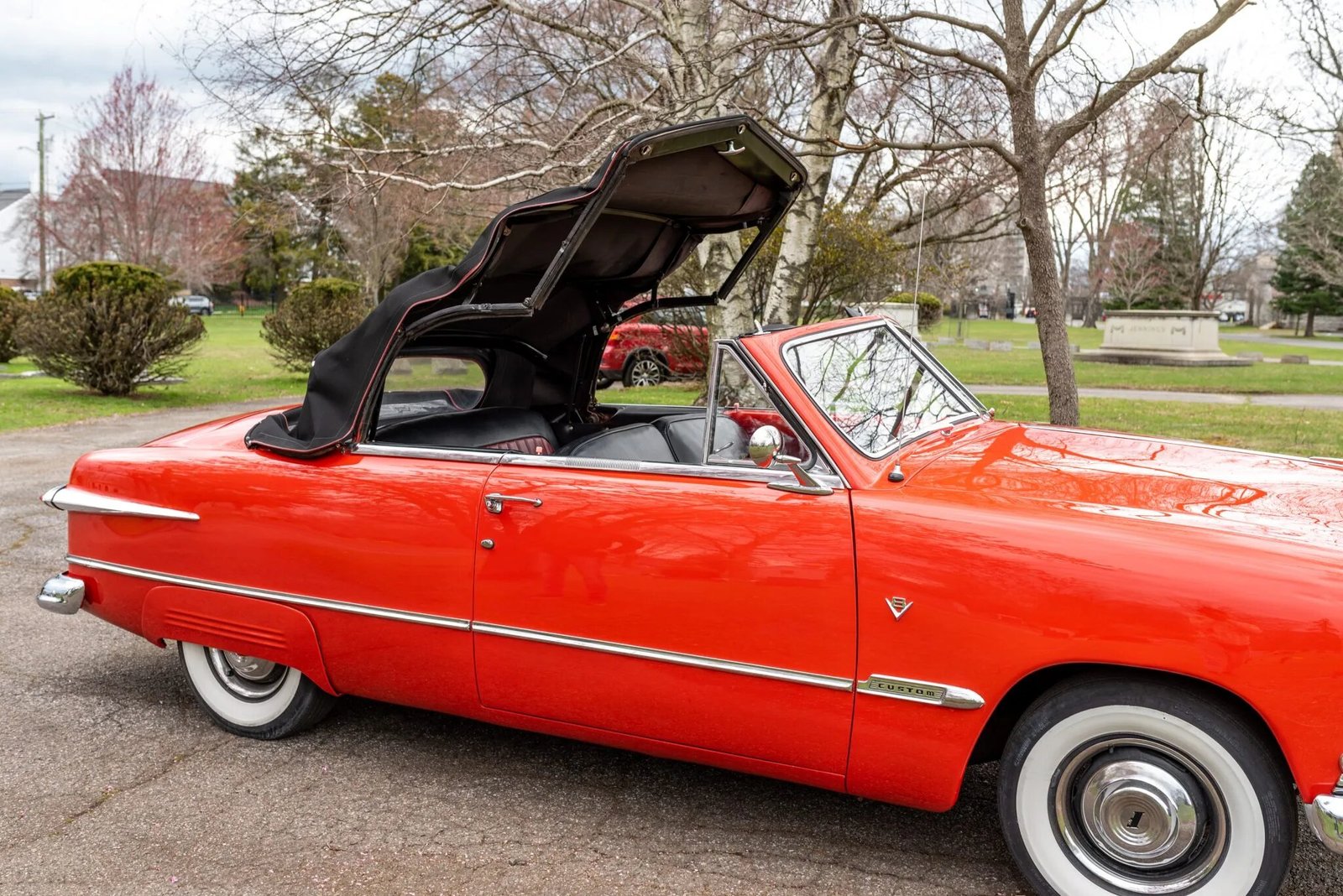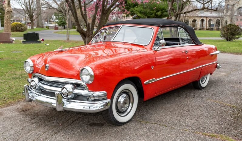 This 1951 Ford Custom Deluxe convertible is powered by a 239ci flathead V8 paired with a column-shifted three-speed manual transmission and is finished in red over two-tone vinyl upholstery.