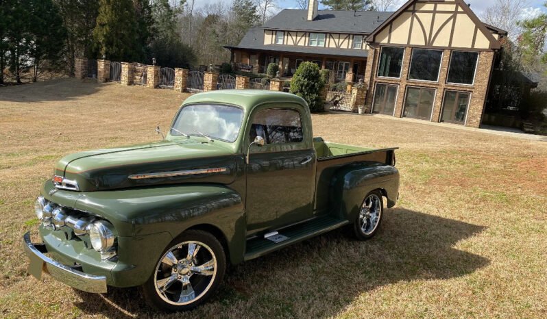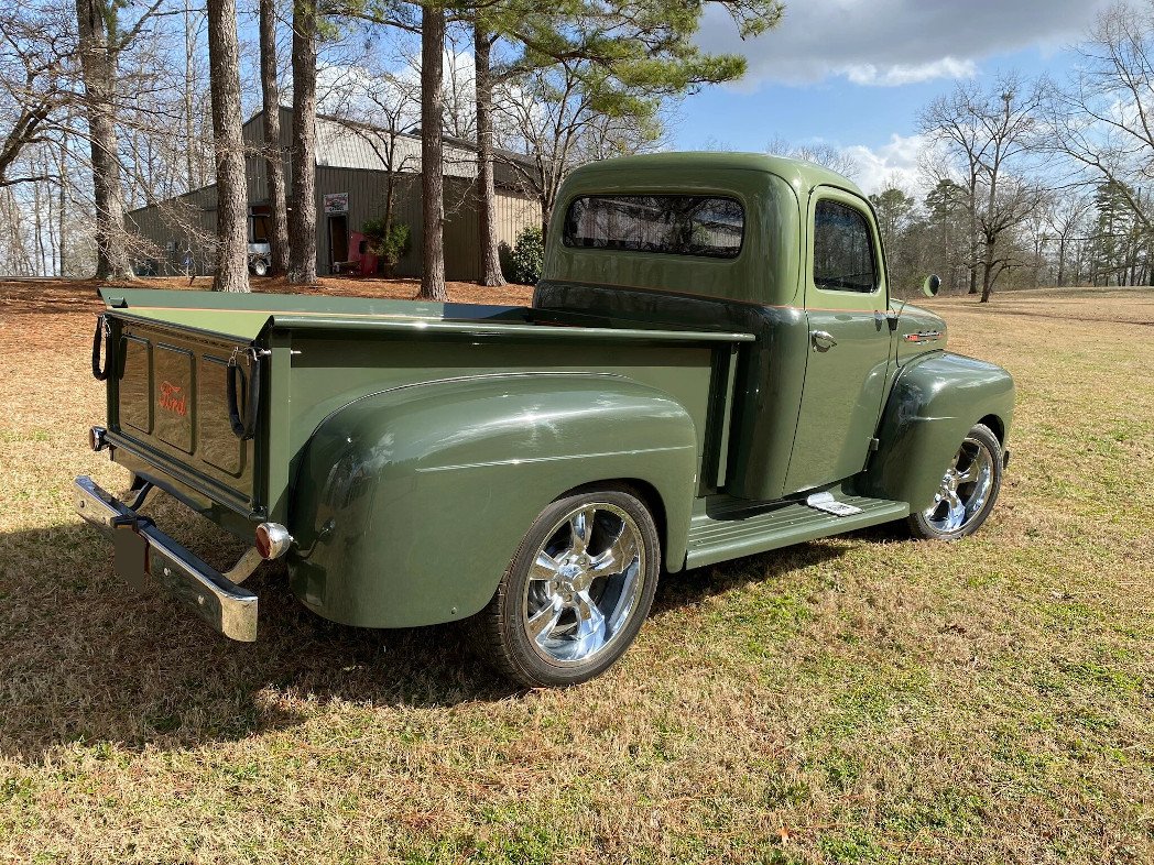 This 1951 Ford F-1 pickup is finished in two-tone green over brown leather and is powered by a carbureted 239ci flathead V8 with aluminum cylinder heads paired with a three-speed C4 automatic transmission.