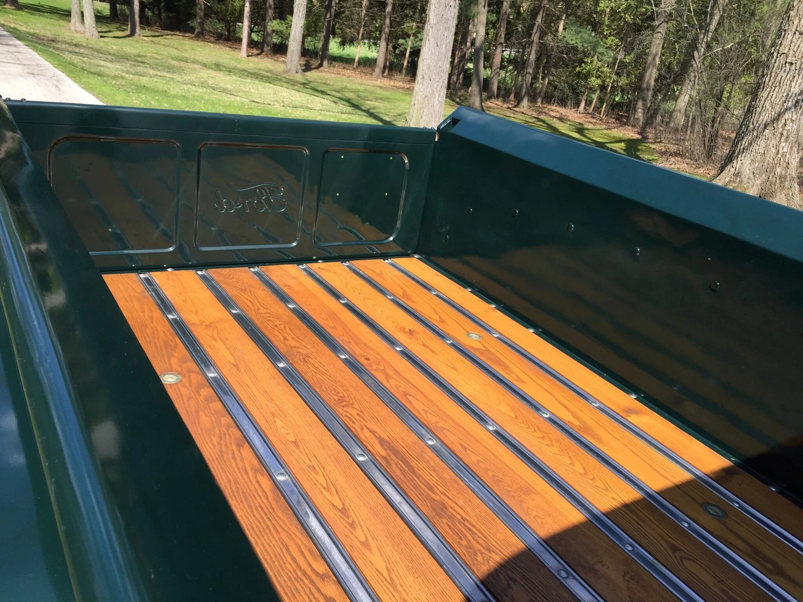 The 15″ wheels wear chrome hubcaps, and the bed floor is made up of refinished wood planks and polished tracks.