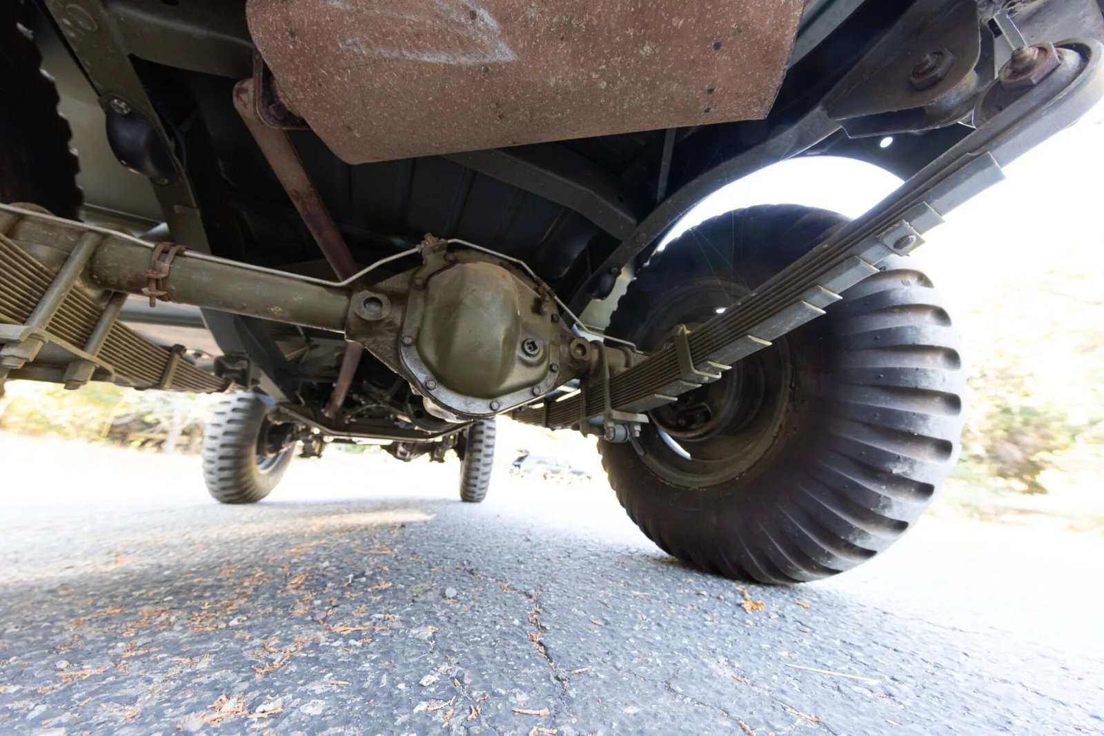 Color-matched 16″ steel wheels wear military-style STA tires, and manually locking hubs are fitted up front.