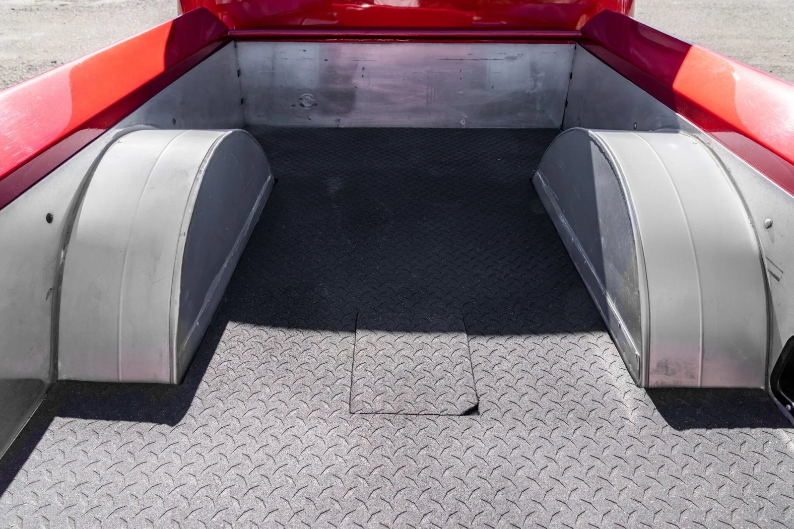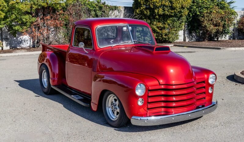 The exterior was repainted metallic red and features a fiberglass hood scoop and running boards, shaved door handles with electric poppers, tubbed rear wheel wells, frenched headlights, and a Chrome front bumper, trim, and side-view mirrors.