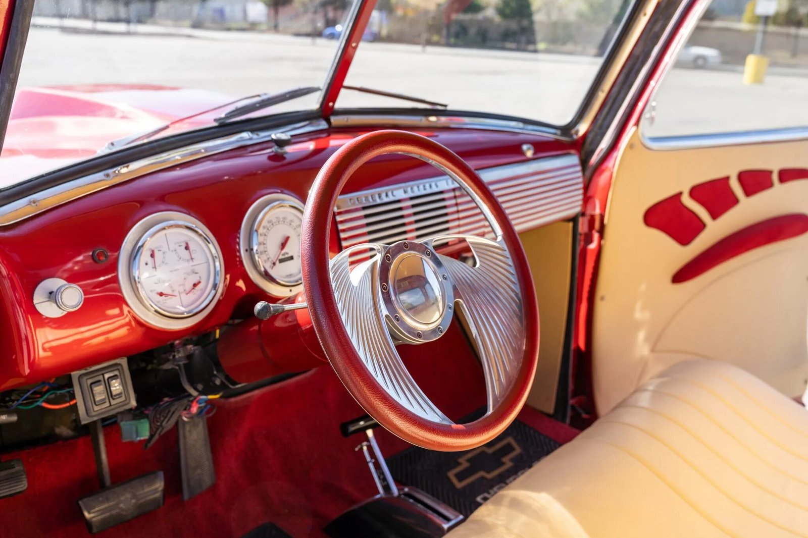 The cabin is equipped with a single bench seat upholstered in beige leather with embroidered roses, a matching rear bulkhead, door panels with red accents, and red carpets lined with Chevrolet-branded floor mats.