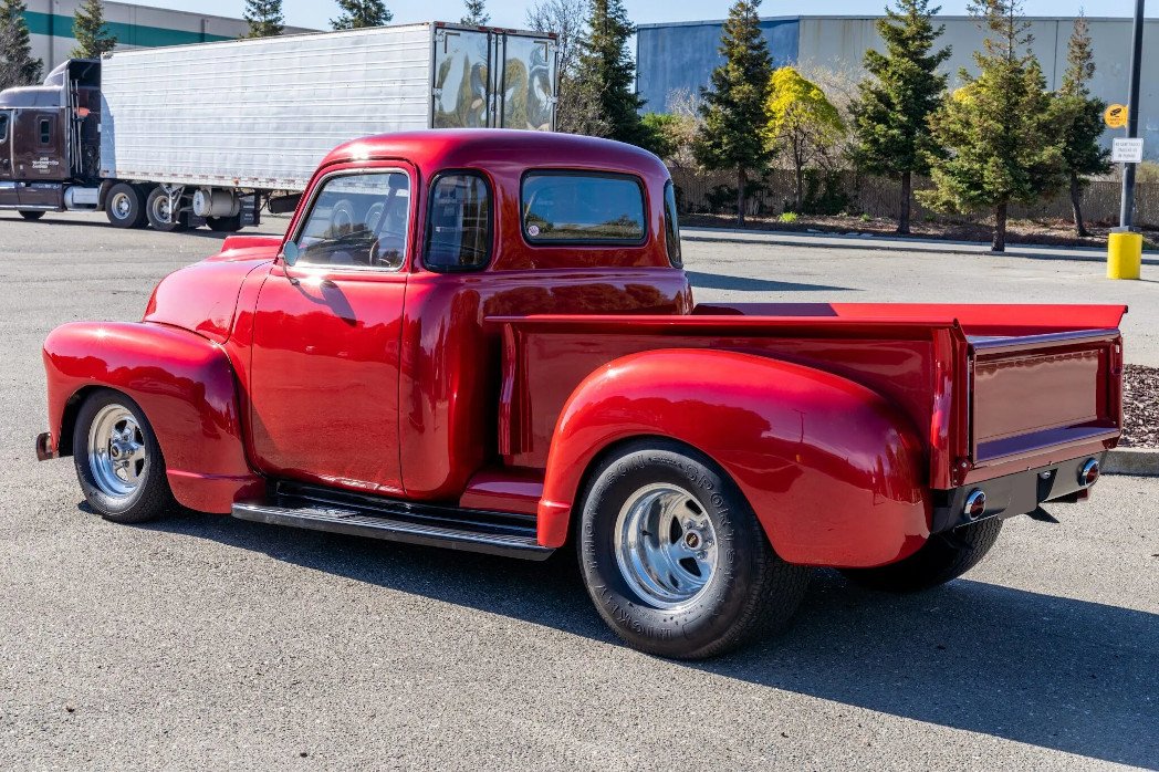 Finished in red over a beige and red interior, the truck is powered by a 350ci V8 paired with a Turbo-Hydramatic three-speed automatic transmission with a reverse manual valve body and a 4.10:1 Positraction rear end.