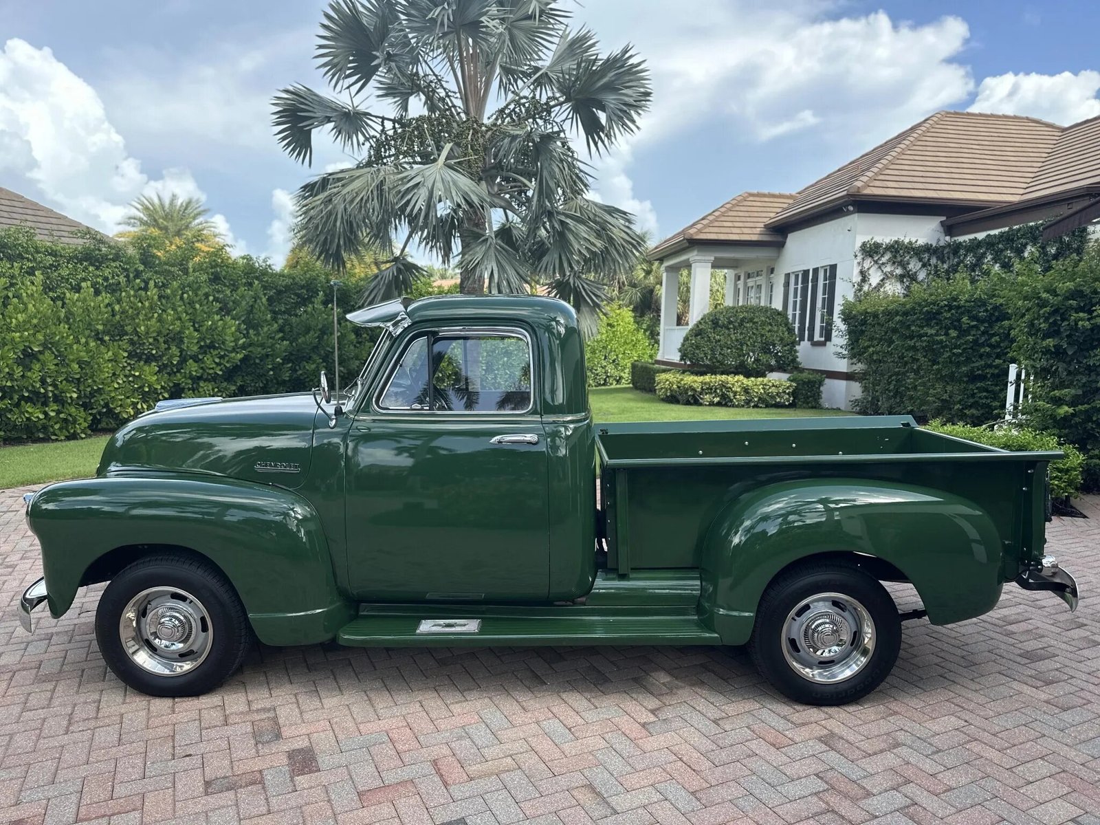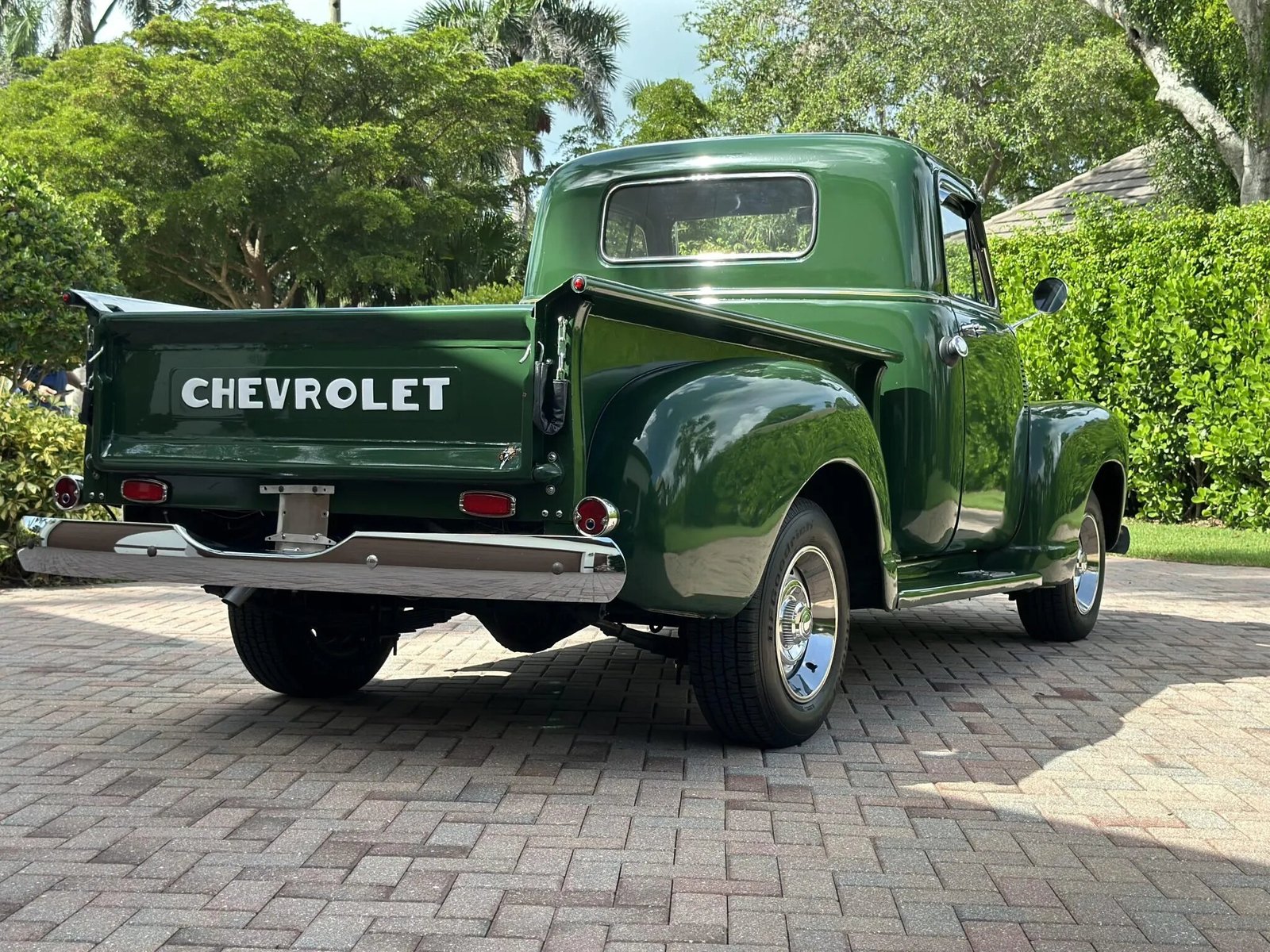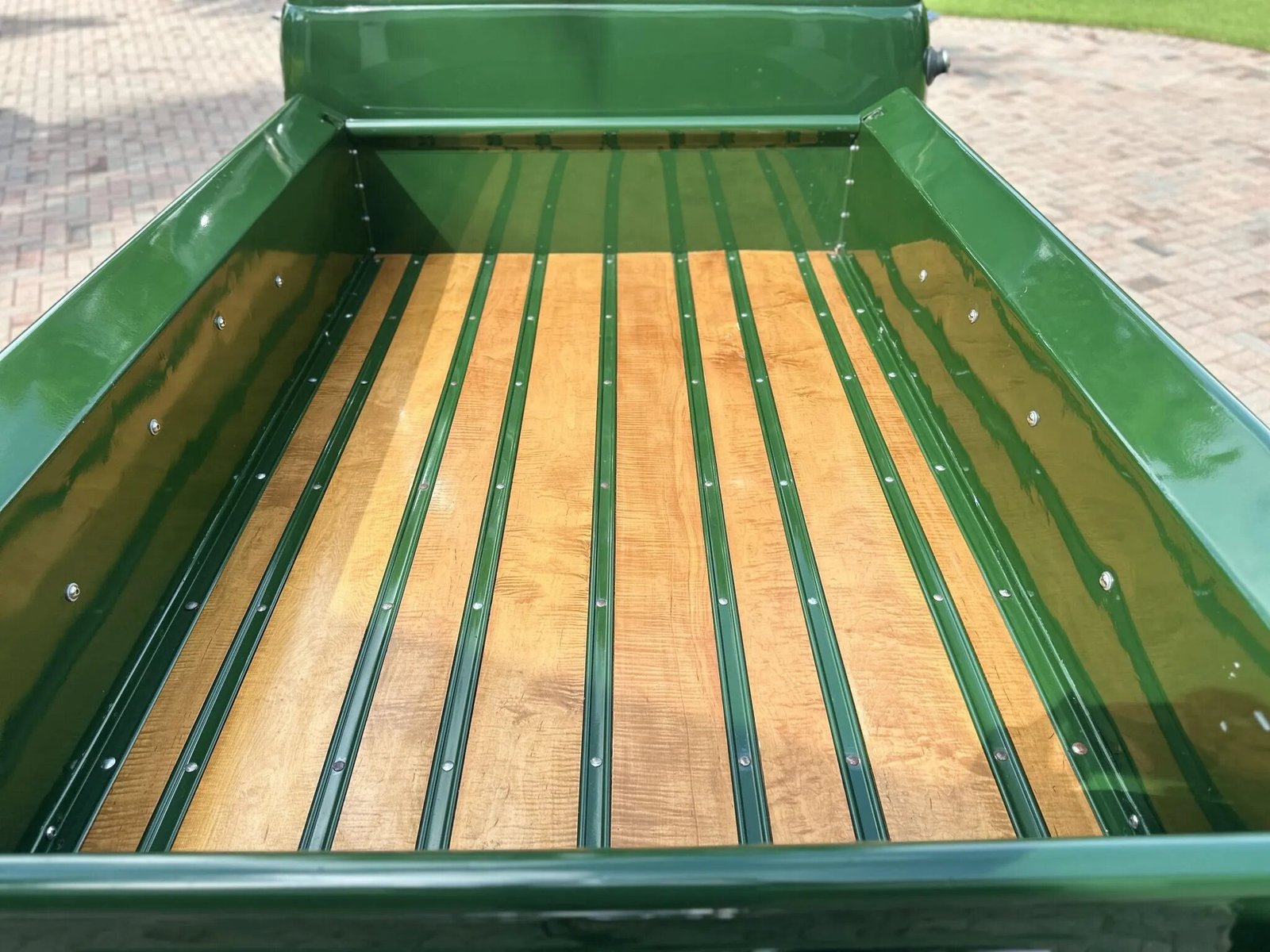 The truck is finished in green and was repainted, exterior details include a chrome grille and bumpers, hooded headlights, Bowtie-branded running boards, a windshield visor, custom taillights, and a wood bed floor with metal runners.