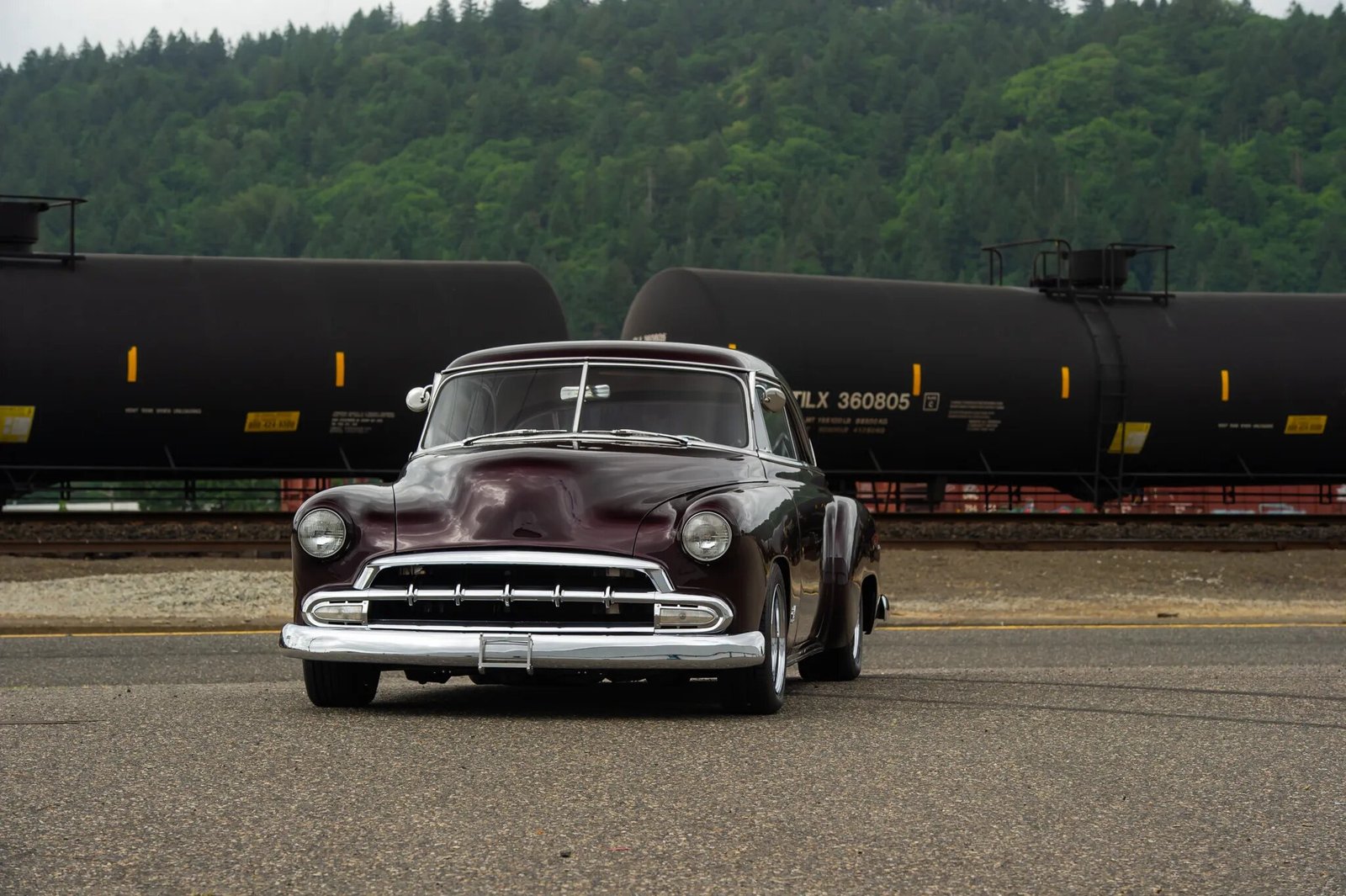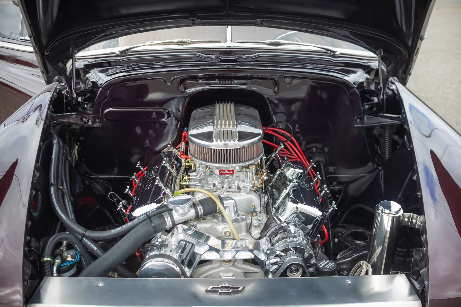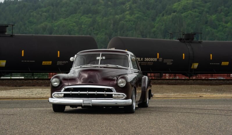 This 1952 Chevrolet Bel Air is finished in dark red over tan cloth upholstery and powered by a 462ci V8 paired with a three-speed automatic transmission. Modifications include shaved and decked body panels, smoothed bumpers, frenched taillights, and tinted glass. It is also equipped with 15″ Rally-style wheels, front disc brakes, dual Edelbrock carburetors, an aluminum radiator, a serpentine accessory-belt setup, Omega Kustom gauges, air conditioning, and a Kenwood stereo.
