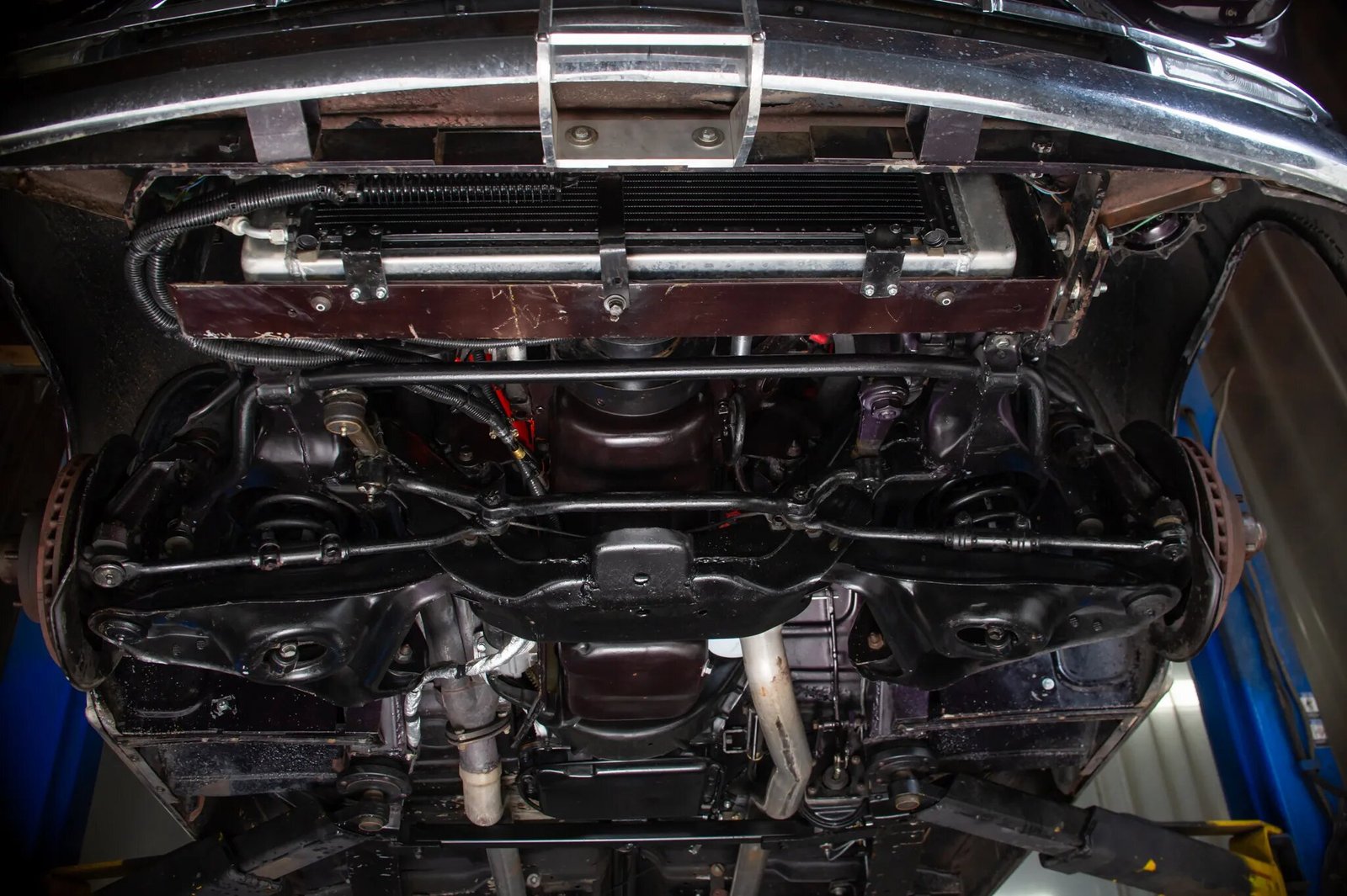 Additional equipment includes chrome Edelbrock valve covers, an Edelbrock finned air cleaner housing, an aluminum radiator with dual electric fans, and a custom exhaust system with tubular headers.