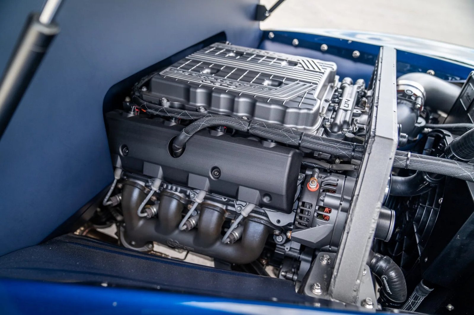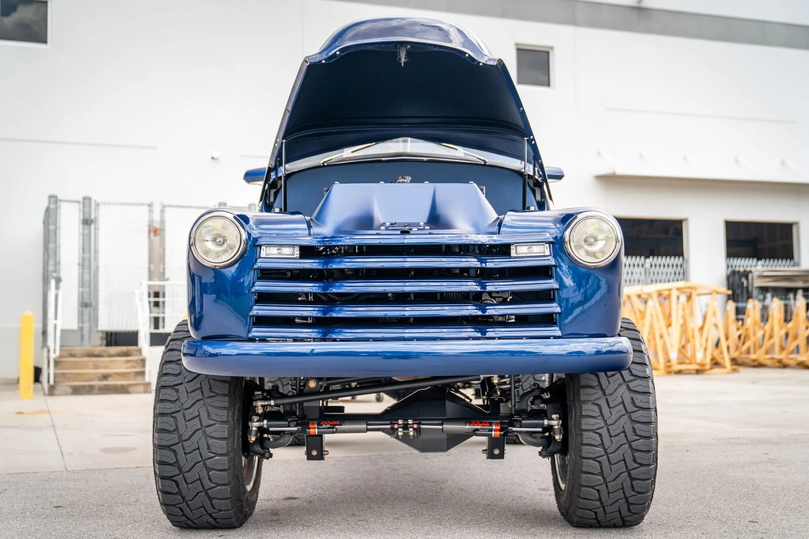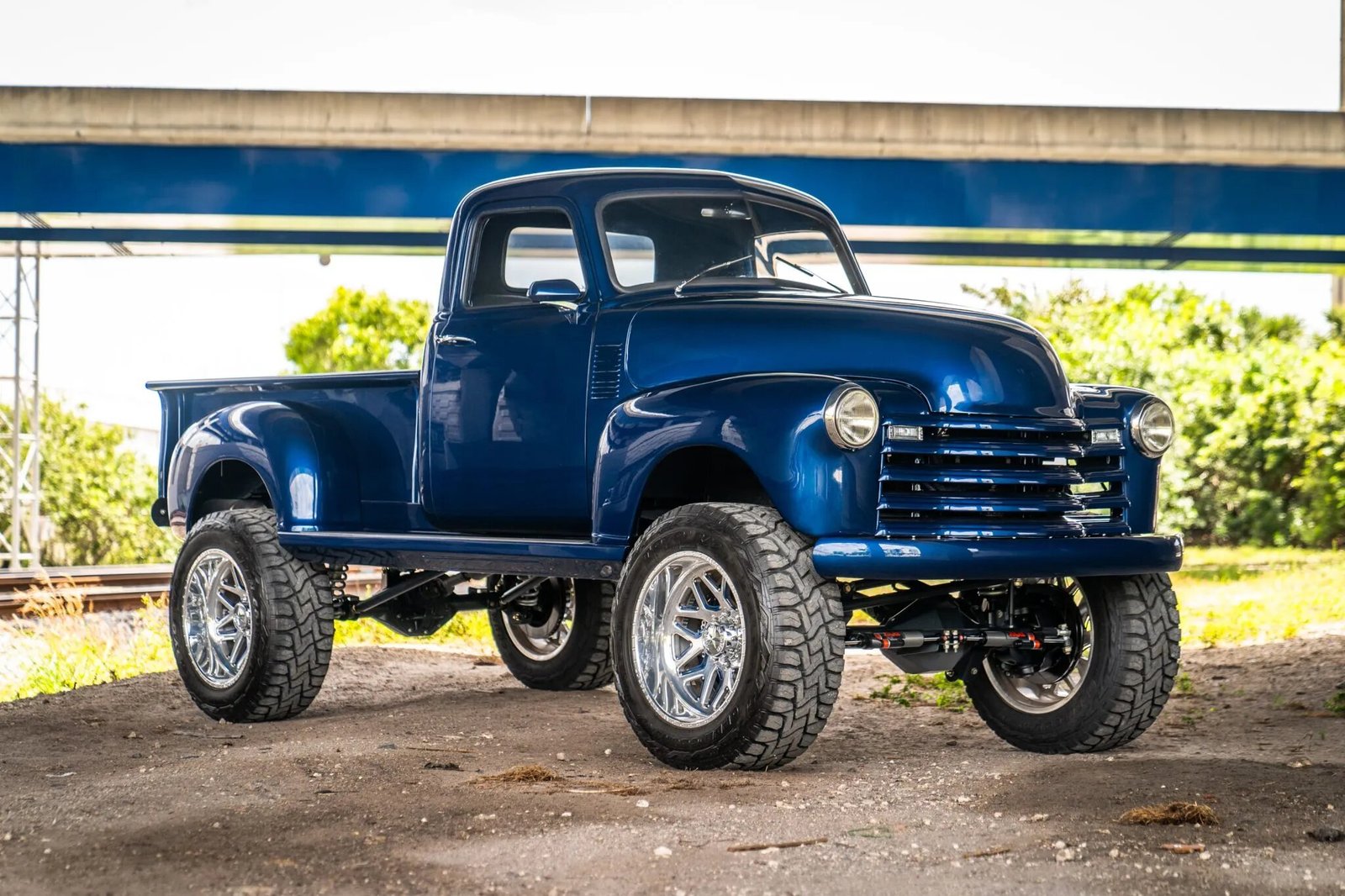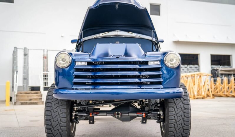 This 1952 Chevrolet Pickup was completed in 2023. It is powered by a supercharged 6.2-liter LT4 V8 backed by a four-speed 4L85E automatic transmission and an Atlas dual-range transfer case with twin-stick shifters. The Currie axles have 5.13 gears, and additional equipment includes Fox dampers, Eibach springs, American Force 22″ wheels, 37″ Toyo tires, Wilwood four-wheel disc brakes, and running boards with integrated power-retractable side steps. The revised bodywork is finished in metallic blue, while the black interior features leather upholstery and a microsuede headliner. Further modifications include a Vintage Air climate control system, a Rockford Fosgate multimedia head unit, and a locking cargo box in the truck bed.