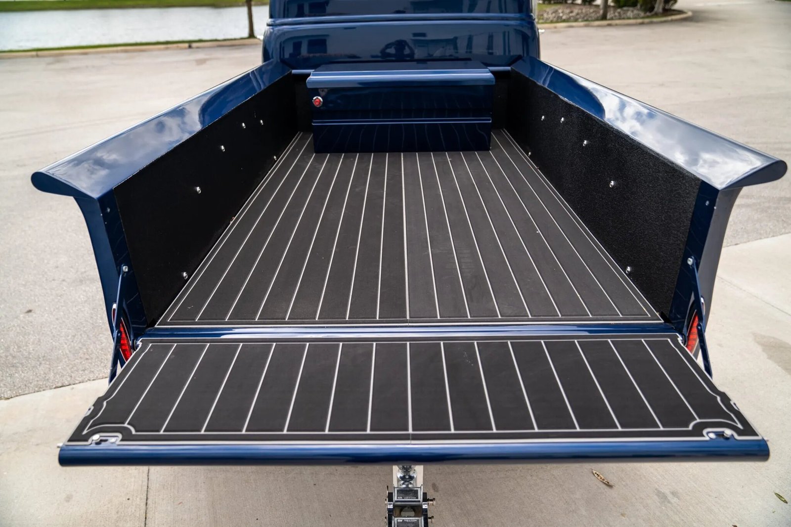 The truck has been refinished in metallic blue with a color-matched grille and bumpers. Power-retractable side steps extend from the fabricated running boards. A body-color locking storage box is housed in the truck bed, which is finished in black bedliner material. The receiver hitch has a B&W adjustable ball mount.