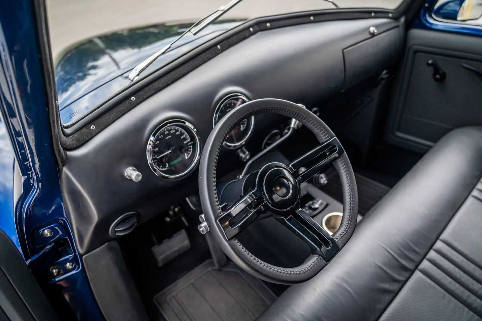 The bench seat is trimmed in black leather, the color-coordinated door panels have perforated inserts, and the headliner is trimmed in microsuede. A Vintage Air climate control system is installed. A Rockford Fosgate multimedia head unit is housed in the center console and linked to speakers concealed in the footwell and behind the seats.