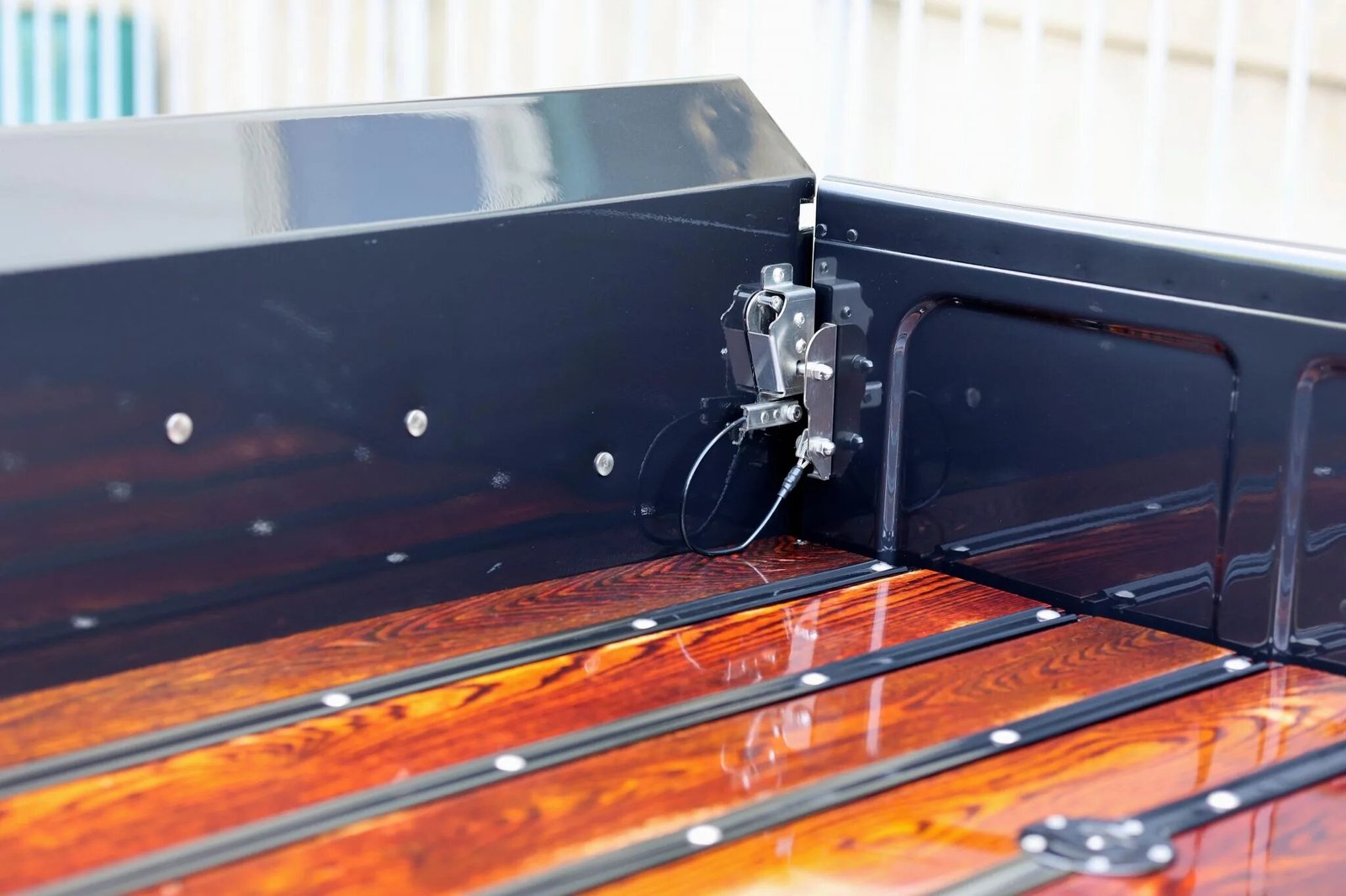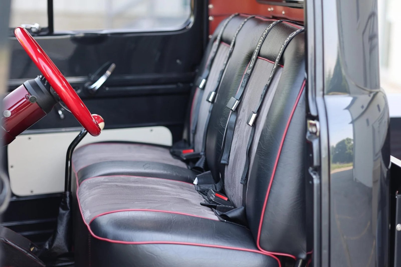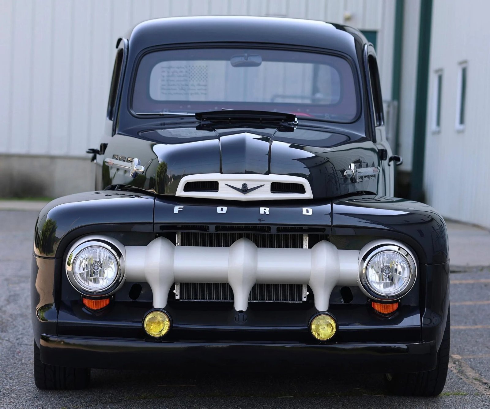 This 1952 Ford F-1 Pickup is finished in slate gray with a white oak bed floor over black and is powered by a 5.0-liter Coyote V8 mated to a Tremec TR3650 five-speed manual transmission and a limited-slip differential.