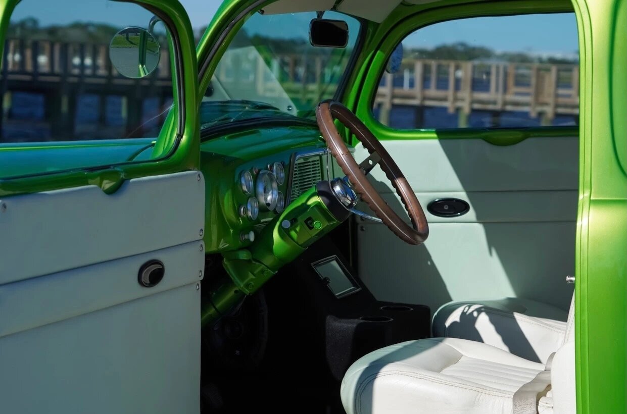 The body was modified with a chopped roof, shaved door handles, deleted bumpers, and a repaint in its current shade of metallic green.