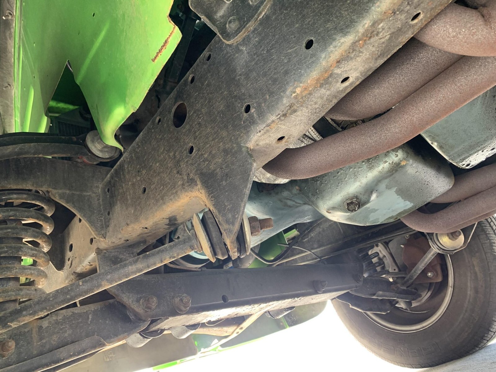 Cream-painted 15″ steel wheels feature chrome hubcaps and are mounted with 215/70 General Ameri GS60 front and 255/70 Summit GT Radial Trac rear tires.