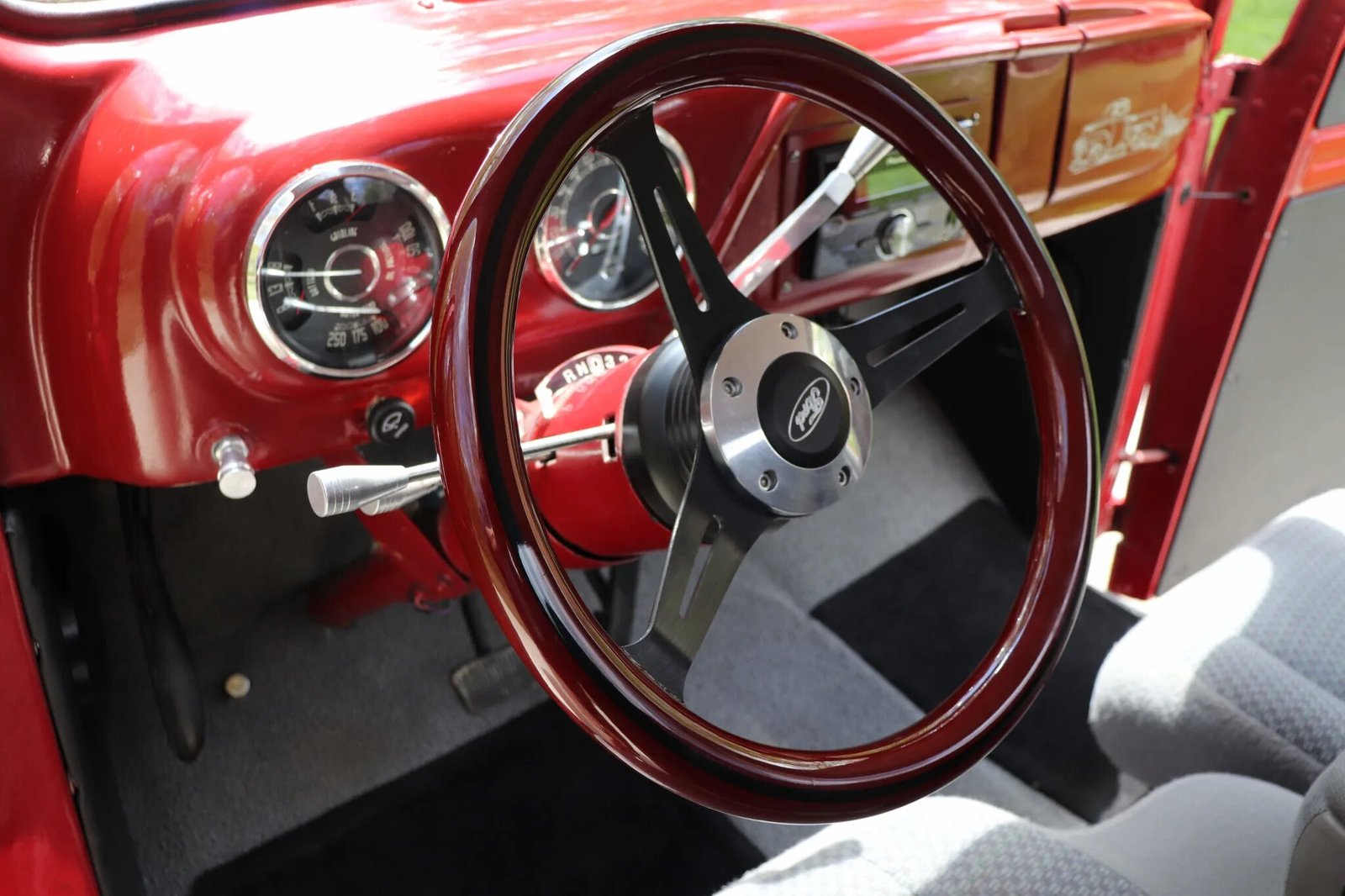 A wood-rimmed steering wheel on a tilting column frames New Vintage USA instrumentation in a body-colored steel dash.