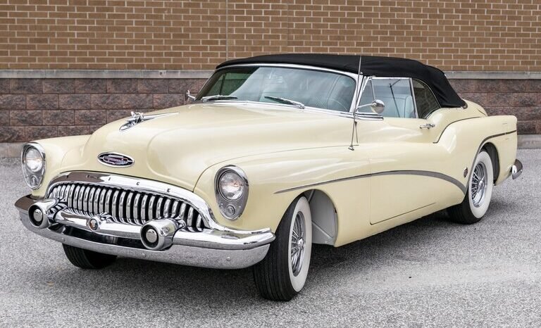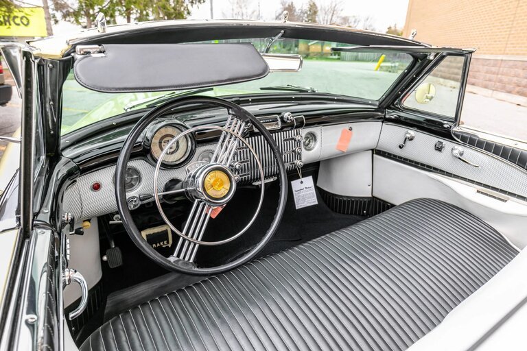 This 1953 Buick Skylark convertible is finished in yellow over black and white upholstery and powered by a 322ci Nailhead V8 paired with a two-speed Dynaflow automatic transmission.