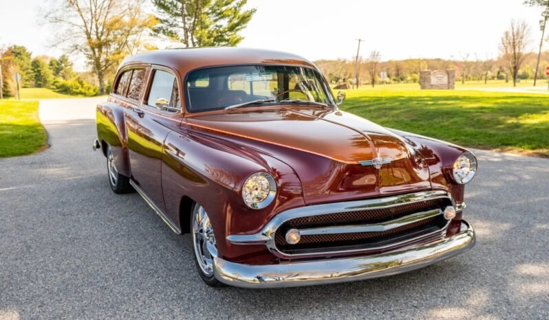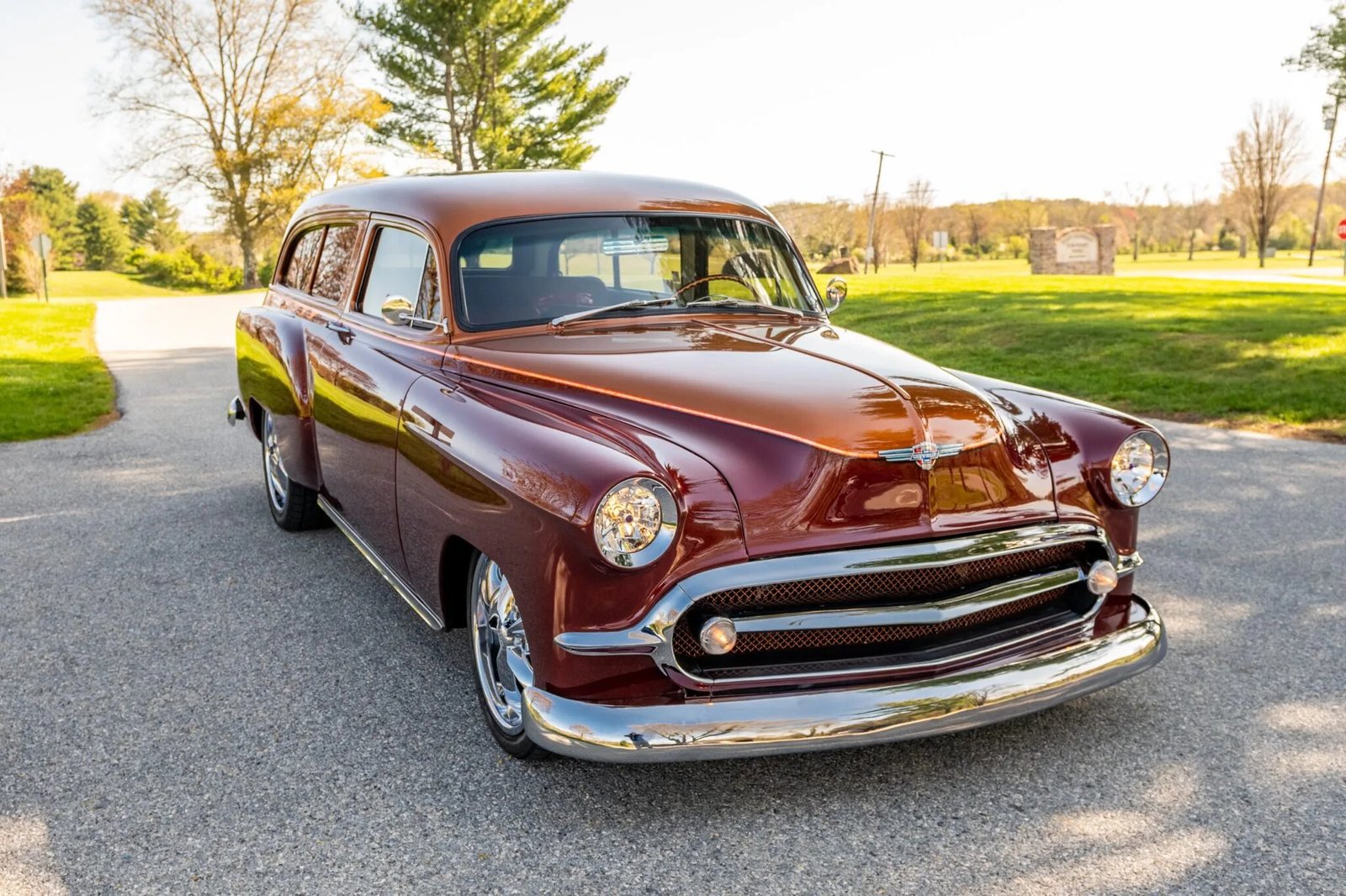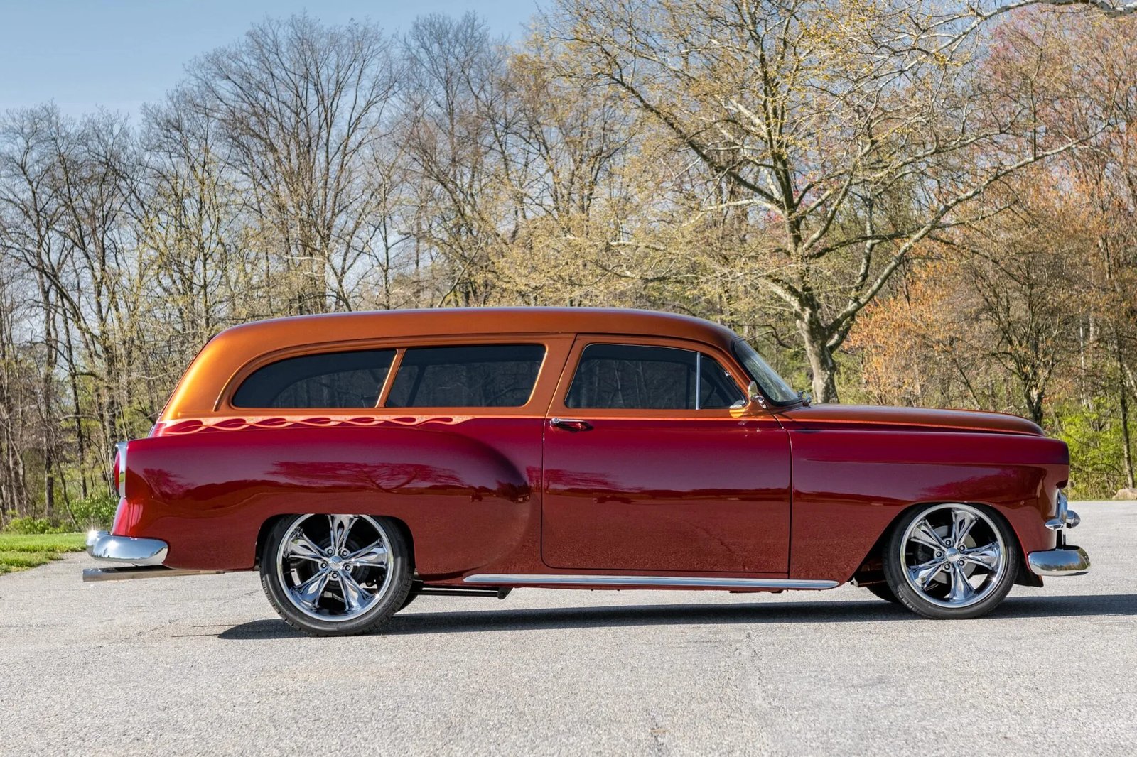 The body is fabricated from two wagon bodies combined with a sedan body and is finished in Red Rock Crystal with a Copper Penny roof and pinstripes that turn into flames under the rear windows.