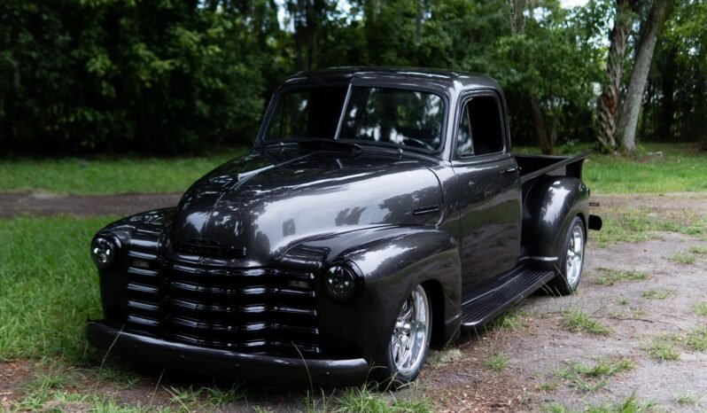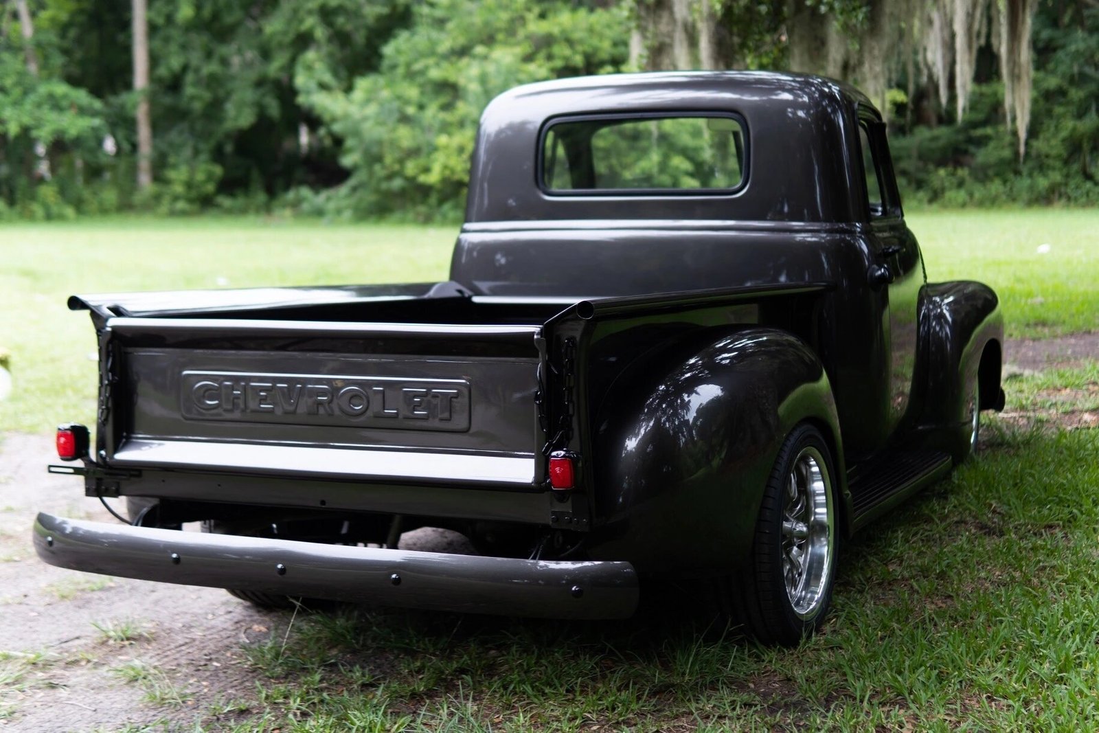 Replacement glass and weatherstripping was installed at that time, and exterior features include a cowl vent, LED lighting, body-colored bumpers and running boards, an oak-lined bed, and a black powder-coated grille, hood ornament, headlamp surrounds, door handles, tailgate chains, and badging.