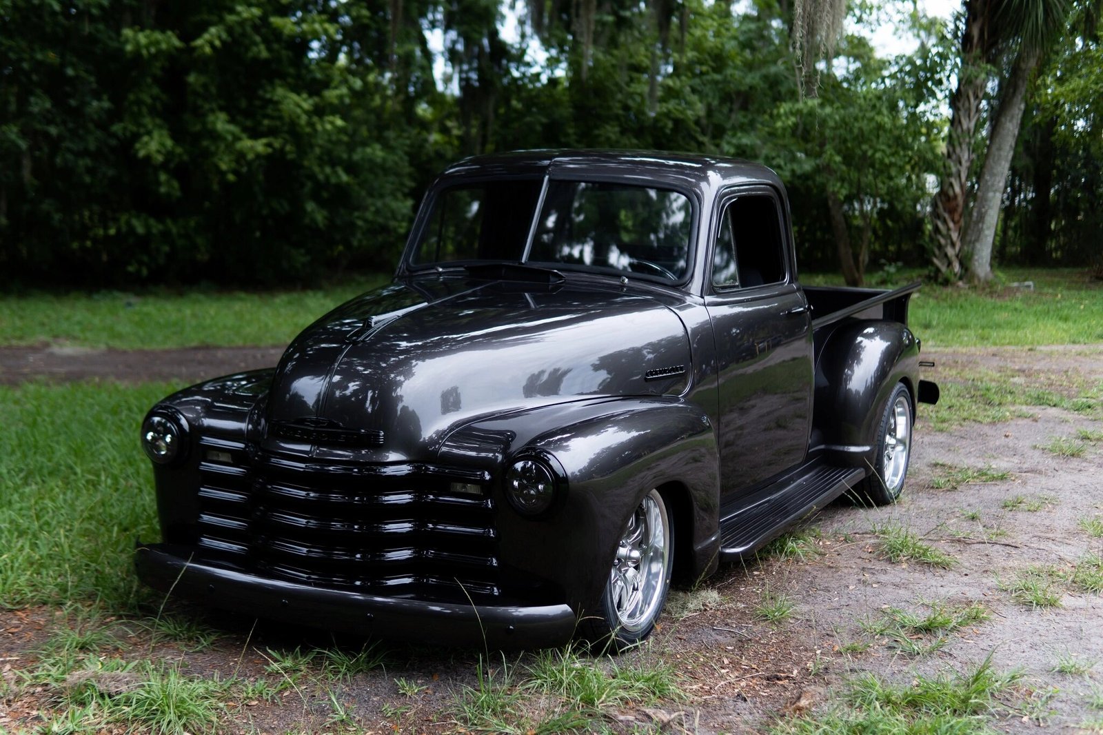 The truck is finished in charcoal over a black interior and is powered by a 235ci inline-six paired with a three-speed manual transmission.