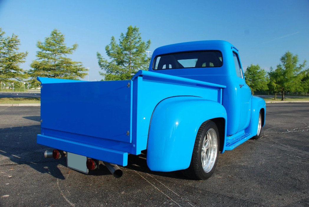 The hood has been converted to hinge at the front, and additional equipment includes a wood-plank bed floor, a front grille sourced from a 1955 F-100, and dual exhaust outlets.