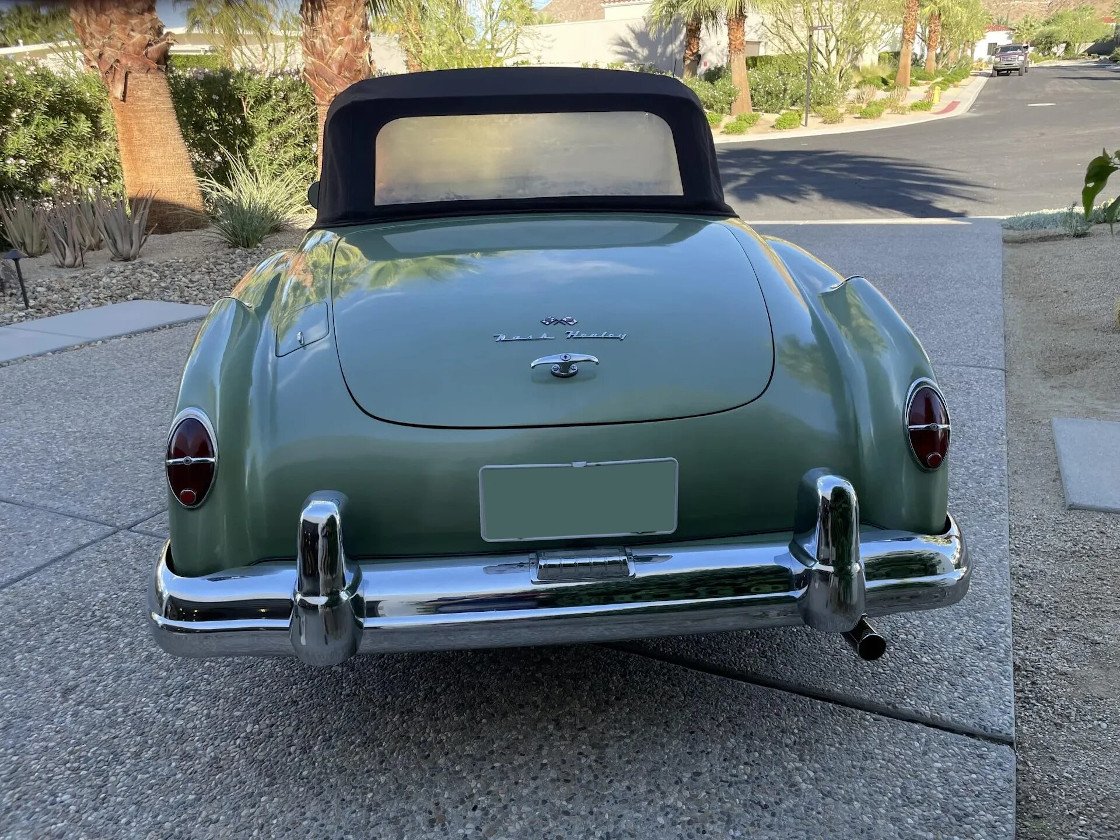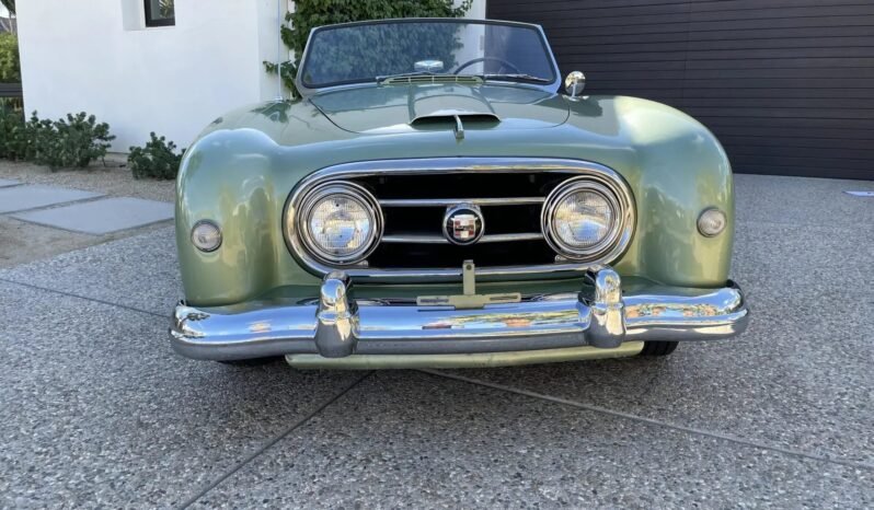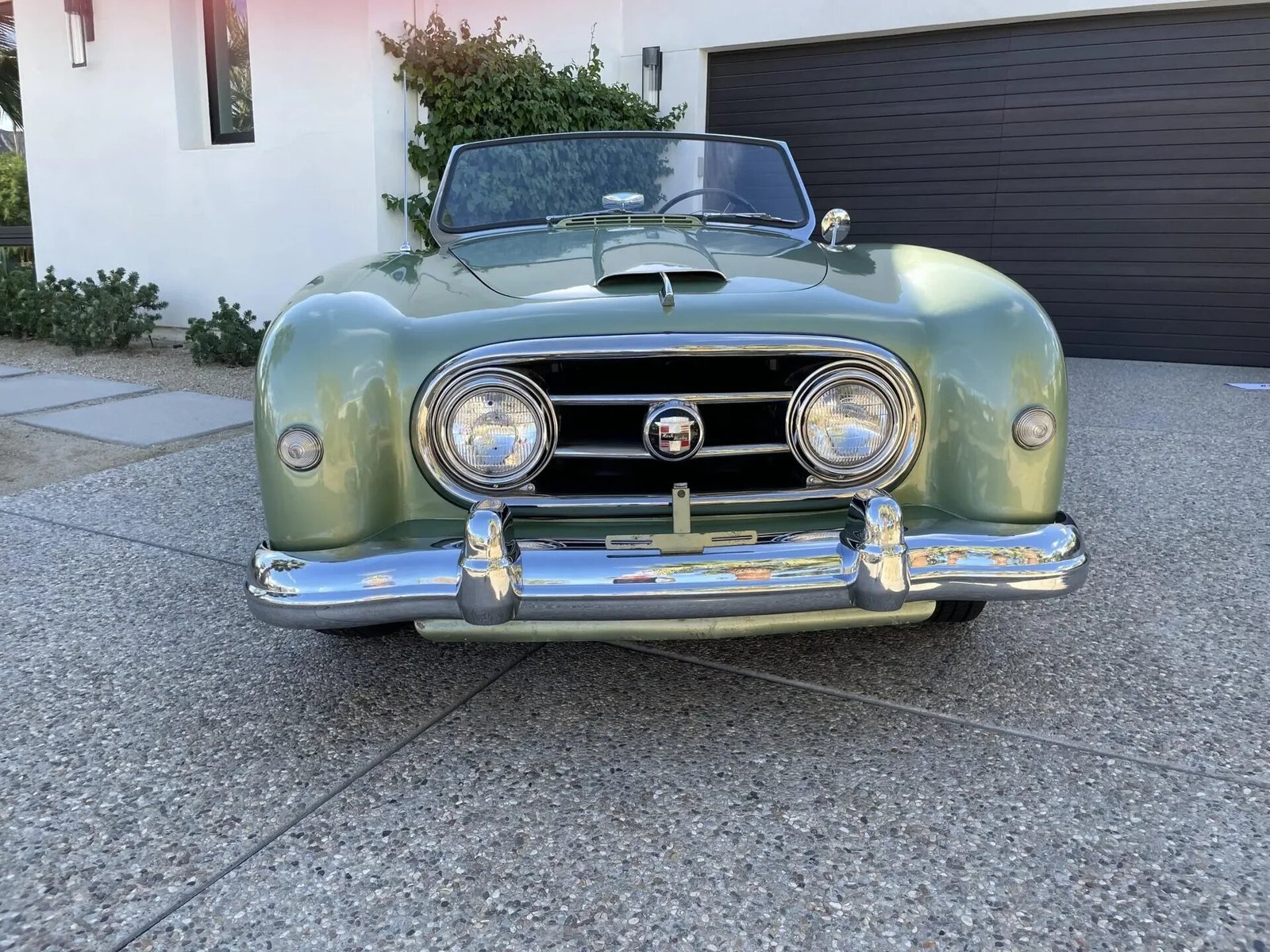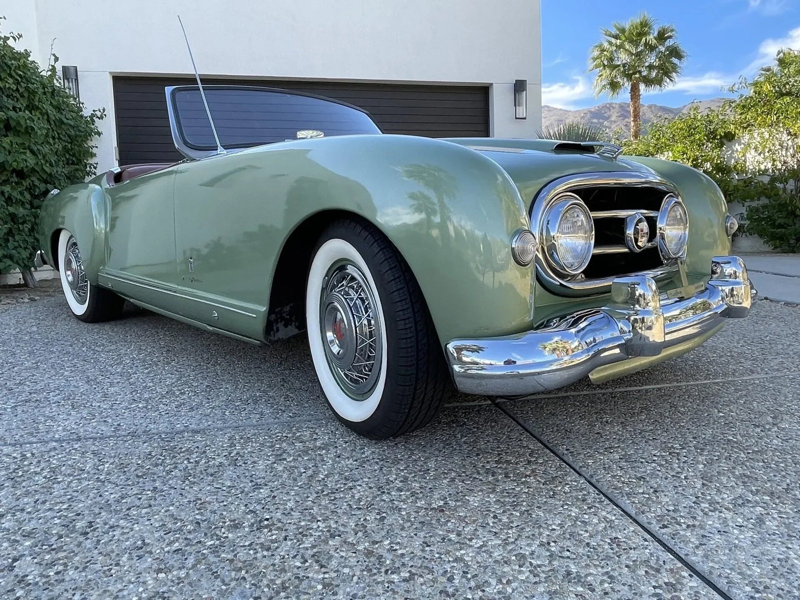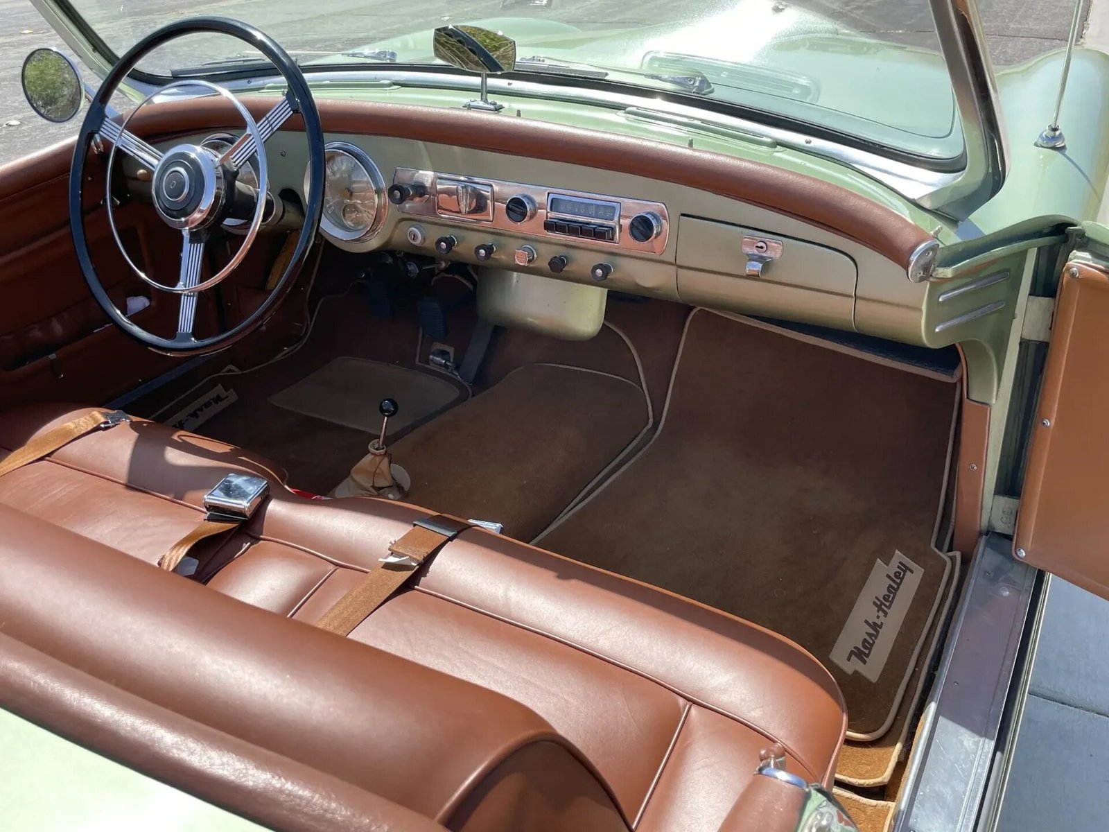 This 1953 Nash-Healey Roadster is one of approximately 500 examples produced between 1951 and 1954. The car is finished in green over brown leather upholstery, and power comes from a 252ci inline-six paired with a three-speed manual gearbox with overdrive. Features include a brown soft top, a six-volt electrical system, an auxiliary electric fuel pump, a heater, lap belts, and an AM radio.
