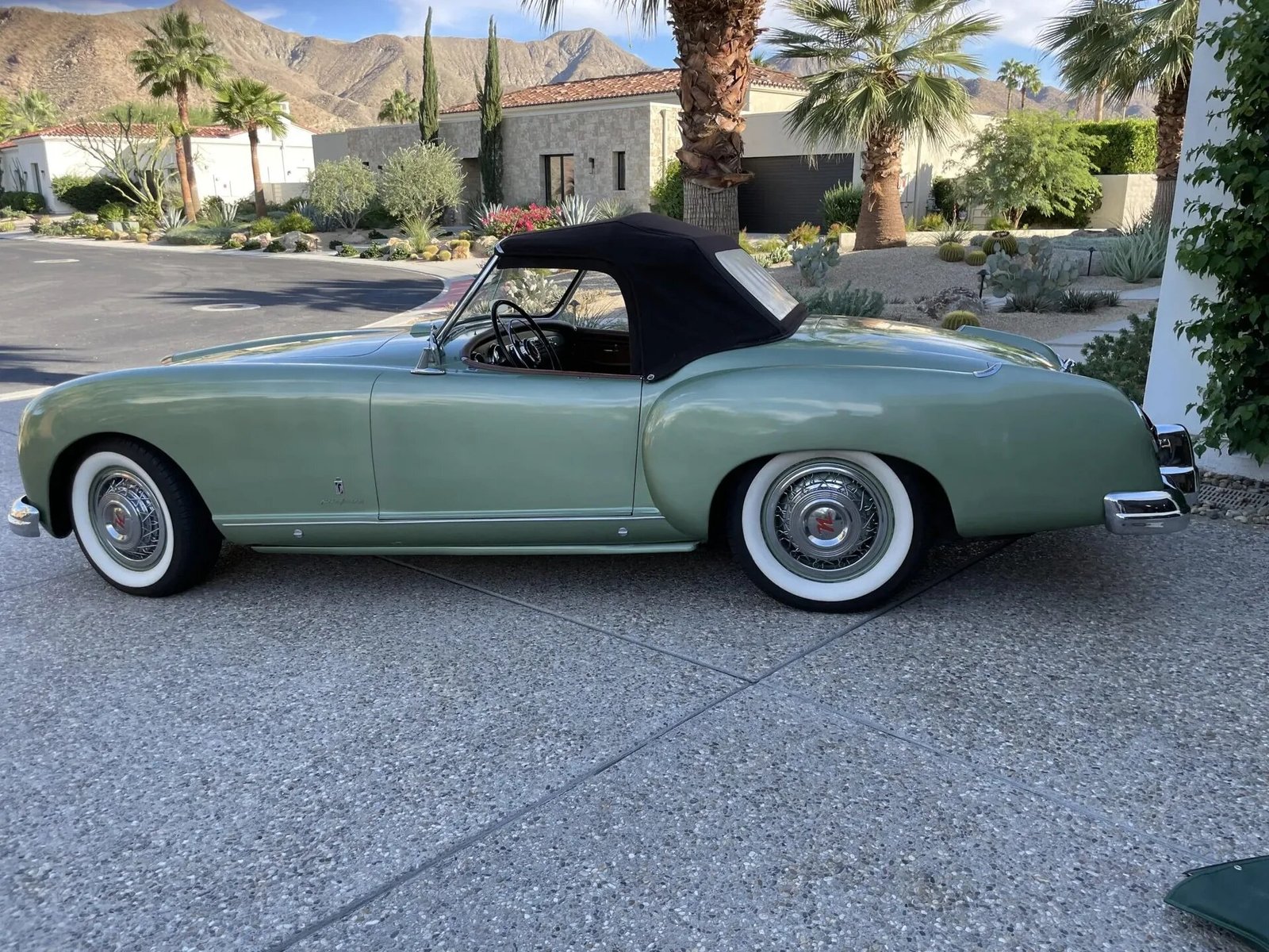 This example was repainted in its current green and features chrome bumpers and trim, a retractable antenna, a driver-side mirror, Pinin Farina fender badges, and a hood scoop. The replacement brown soft top features a clouded plastic rear window.