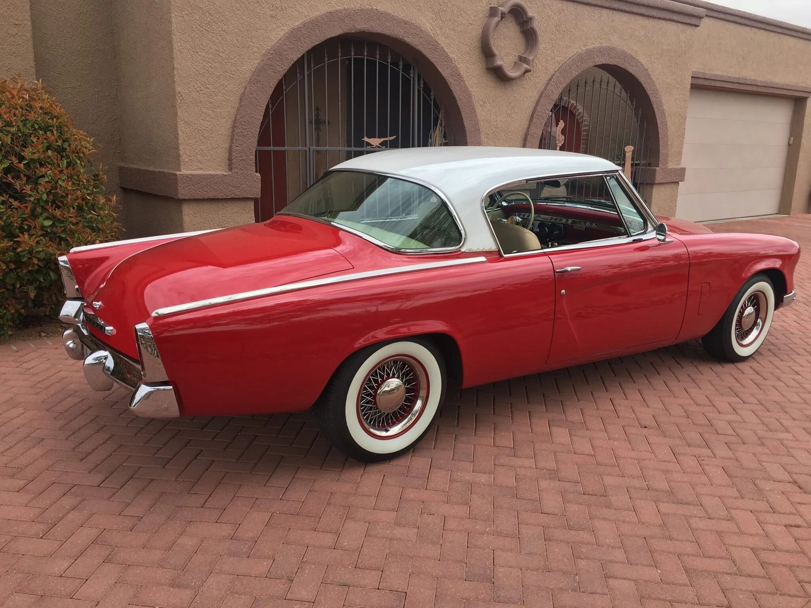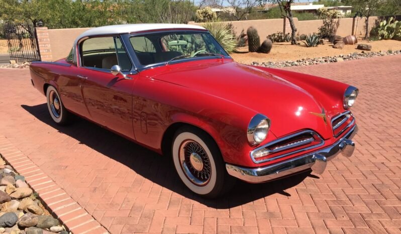This 1953 Studebaker Commander Regal Starliner is finished in metallic red and white over beige and brown and is powered by a replacement 3.8-liter V6 paired with a 4L60E four-speed automatic transmission.