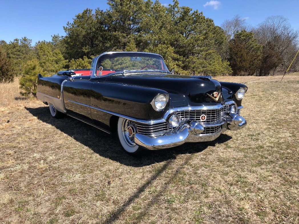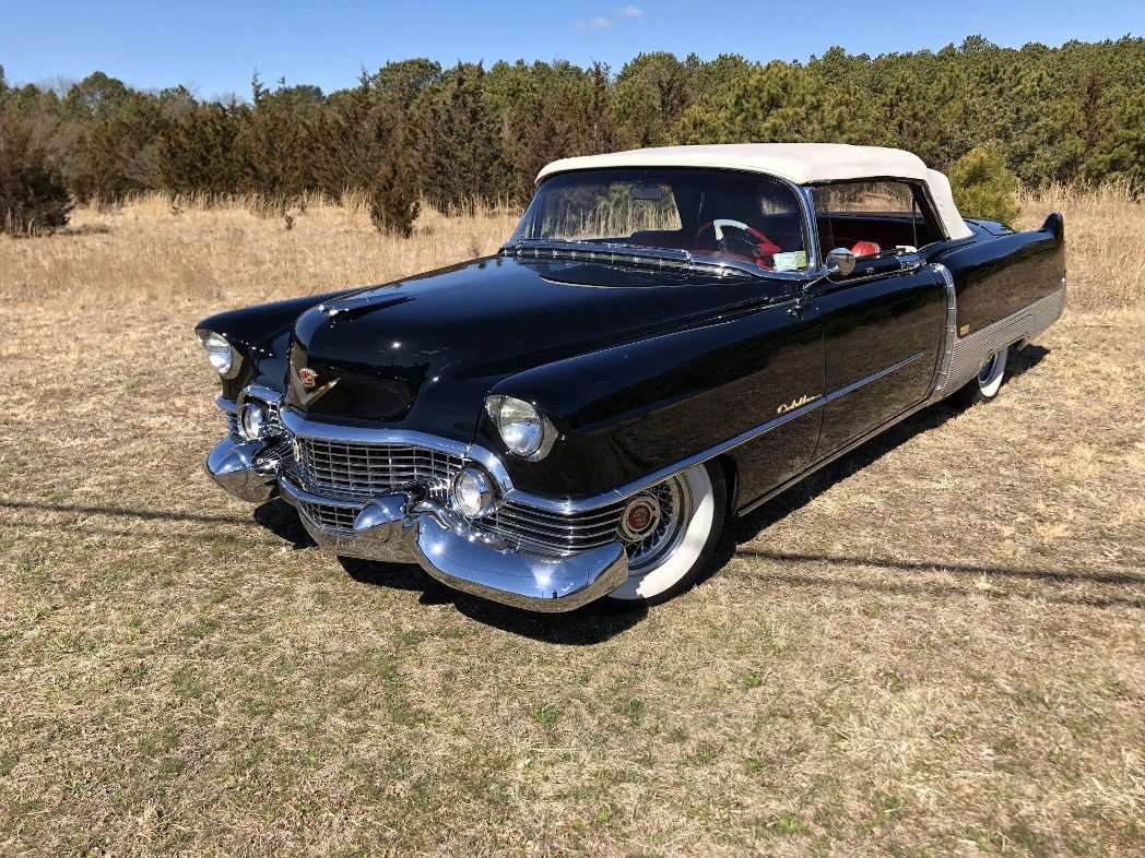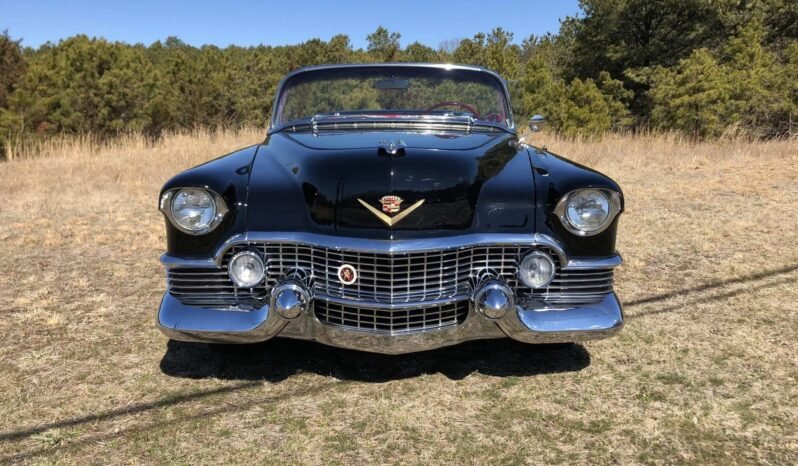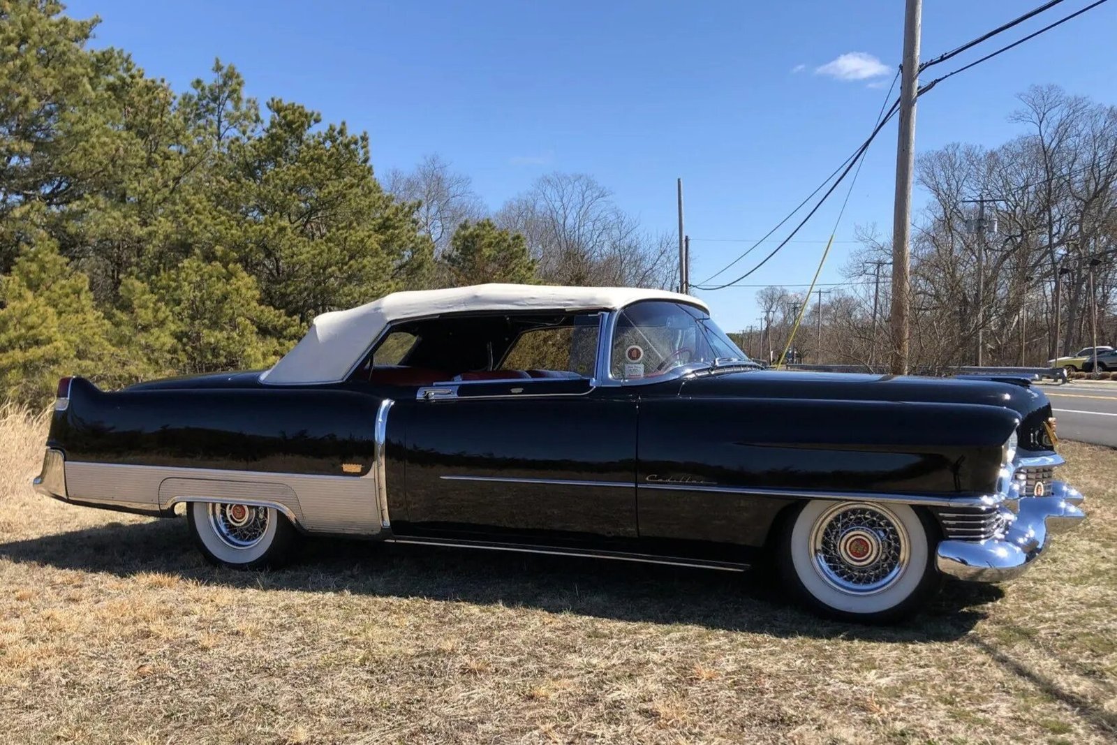 This 1954 Cadillac Eldorado convertible was refurbished in late 1990s. Finished in black with a white soft top over red and white leather upholstery, the car is powered by a 331ci V8 mated to a two-speed automatic transmission. Additional features include a push-button AM radio, a hidden digital CD stereo, and chrome wire-spoke wheels. Electronic ignition and front disc brakes were added.