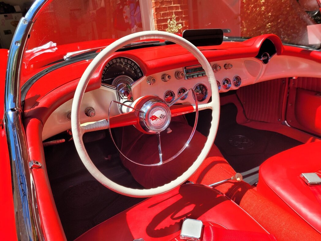 This 1954 Chevrolet Corvette is finished in red over a matching interior and powered by a 235ci Blue Flame inline-six paired with a two-speed Powerglide automatic transmission.