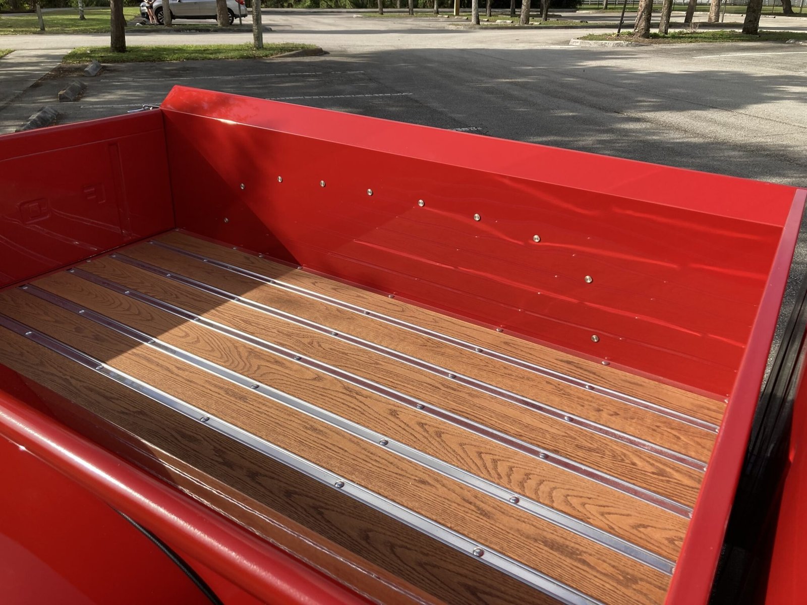 Exterior details include a wood-slat bed floor, black-finished running boards, bright-finished bumpers, and dual side mirrors.