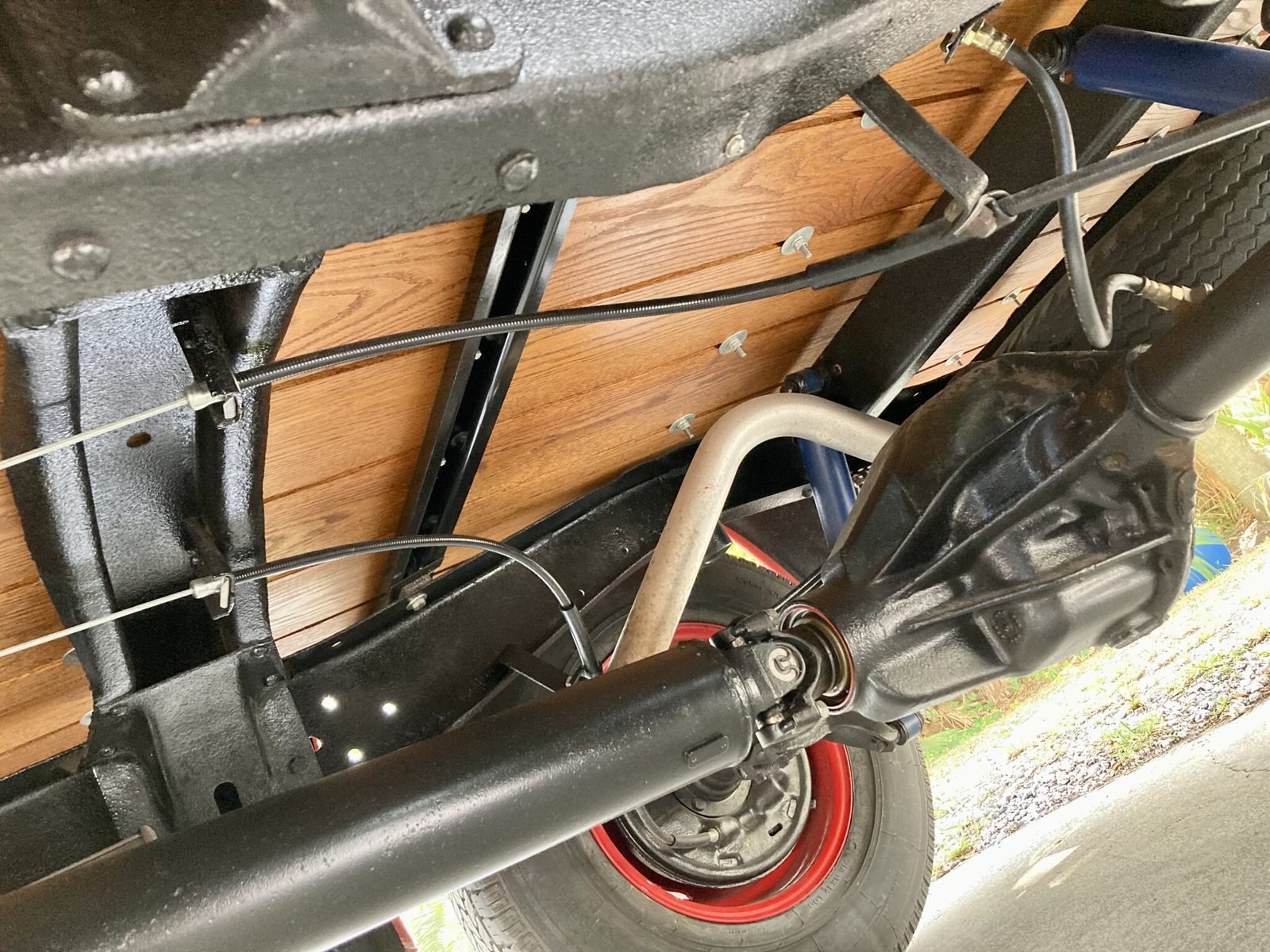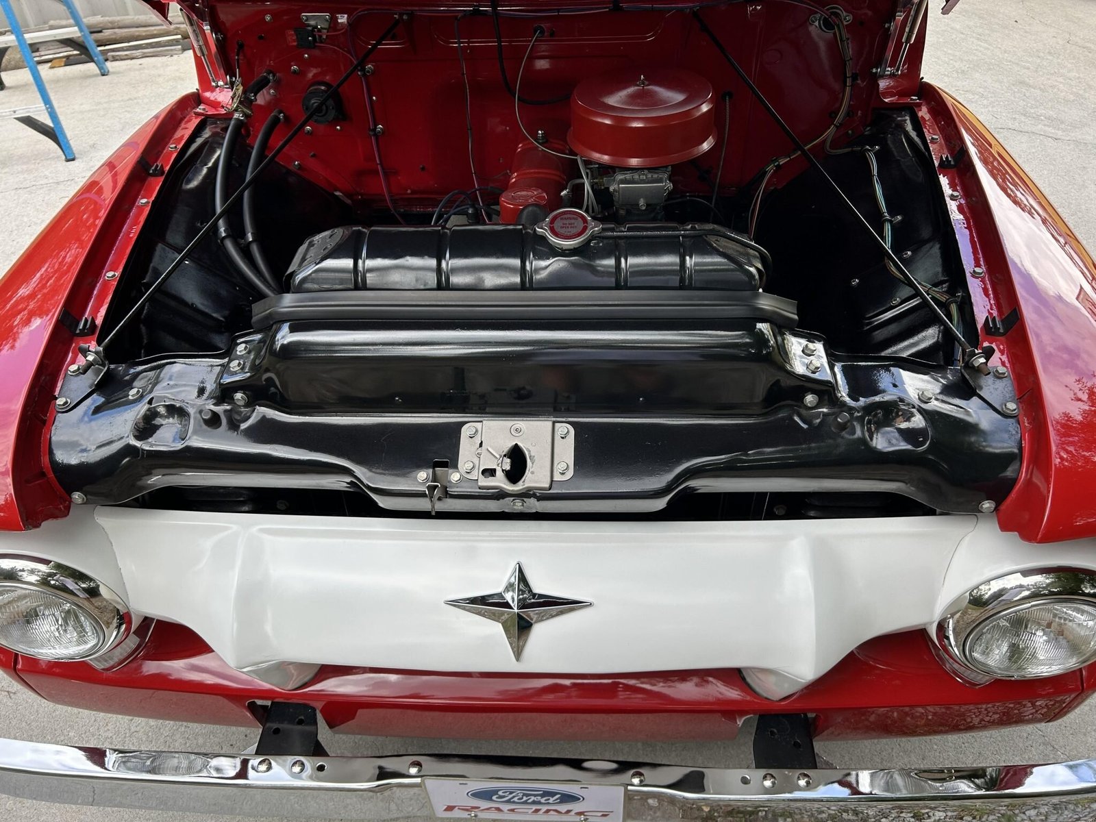 Body-color 15″ steel wheels wear polished covers and are wrapped in 205/75 front and 235/75 rear wide-whitewall Coker Classic tires.