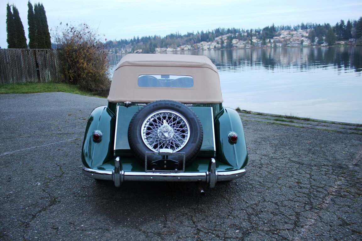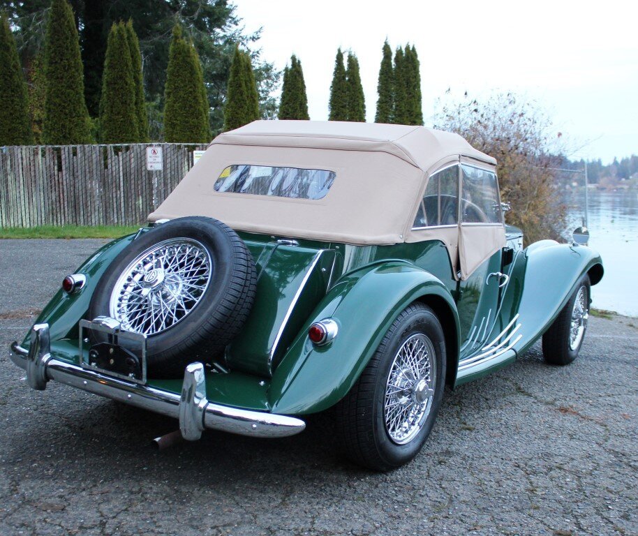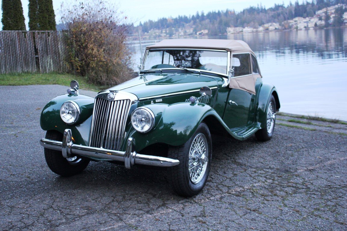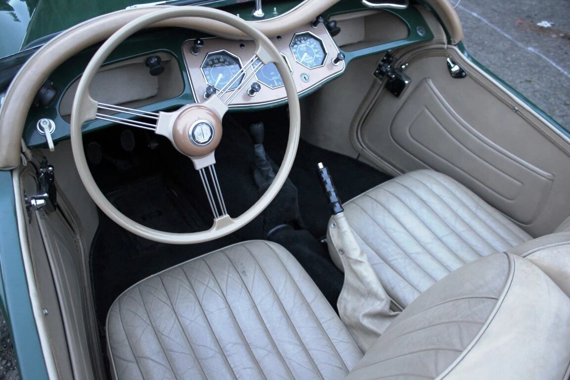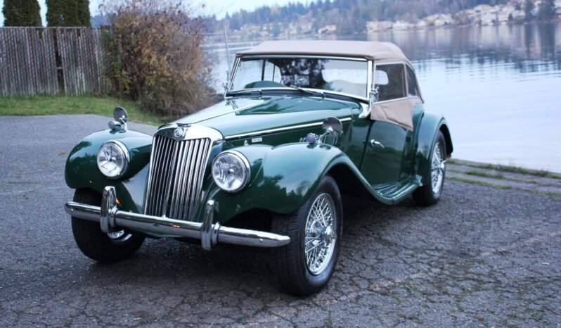 This 1954 MG TF is a left-hand drive example finished in green over a tan interior.