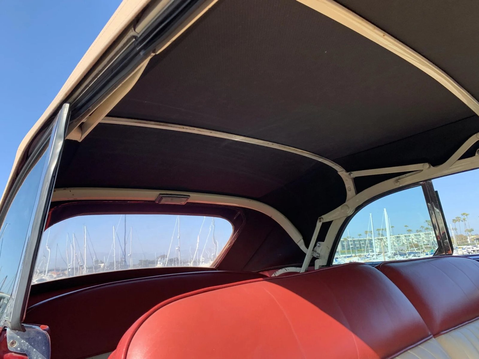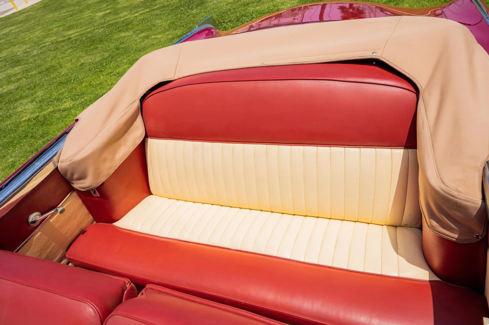 This 1954 Packard convertible is finished in red over red and beige vinyl upholstery and is powered by a 327ci “Thunderbolt” L-head straight-eight paired with a two-speed automatic transmission. Features include power steering and brakes, a push-button AM radio, power-adjustable bench seat, steel wheels with chrome covers, and a power-retractable tan soft top. Work included re-coring the radiator, stripping and resealing the fuel tank, cleaning the heater box and oil cooler, and replacing the water pump, fuel pump, carpet, tonneau cover, driveshaft, soft top, and top hydraulic cylinders.