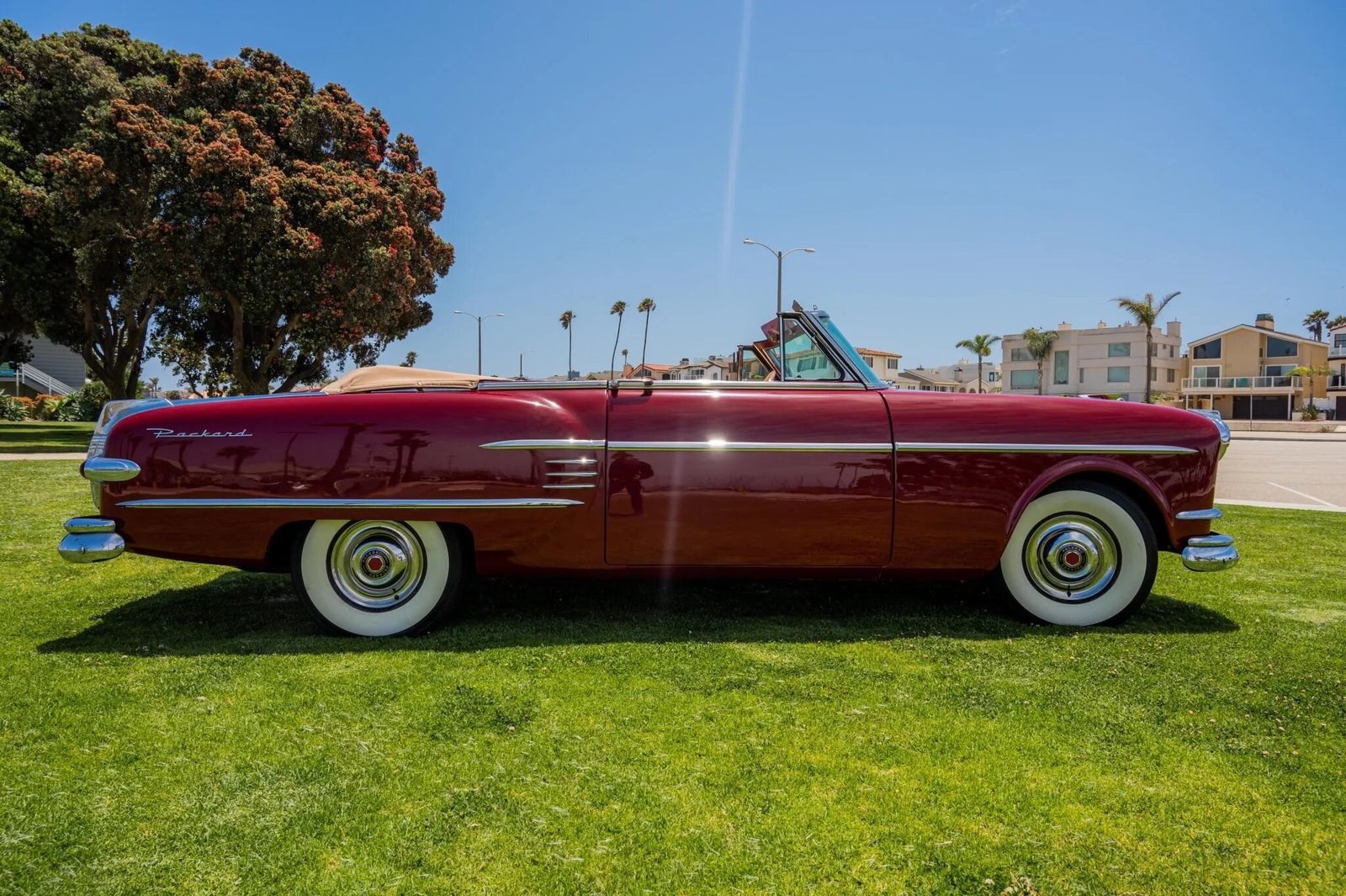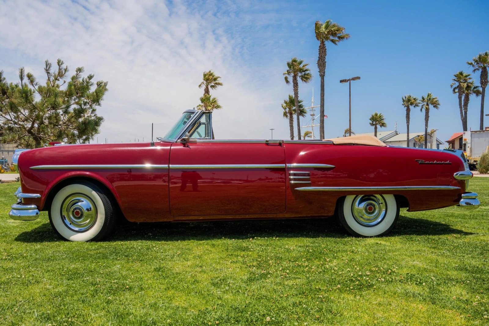 Steel wheels feature chrome Packard-branded covers and are mounted with whitewall tires.