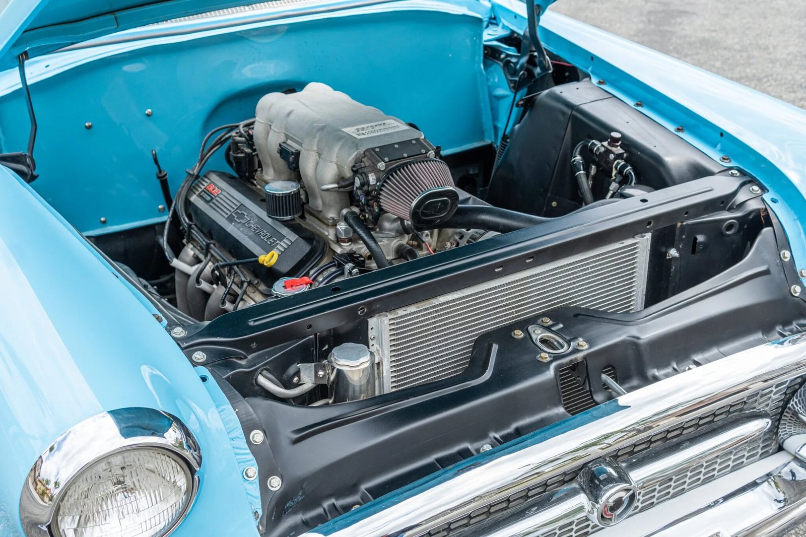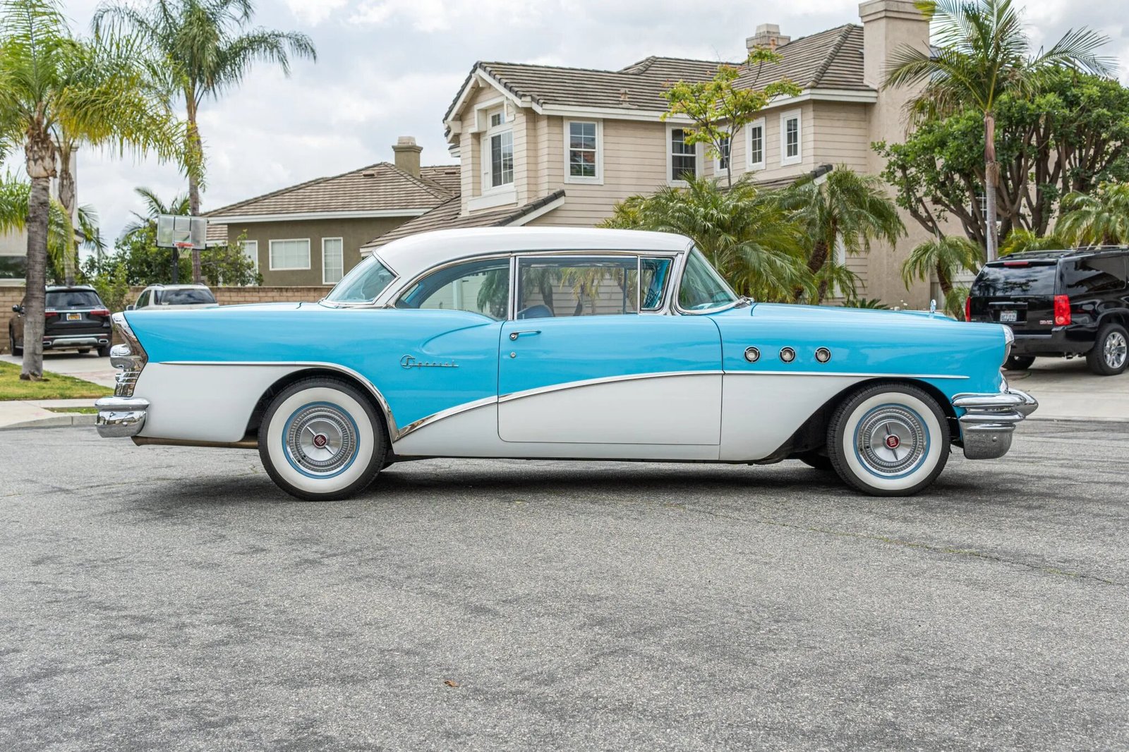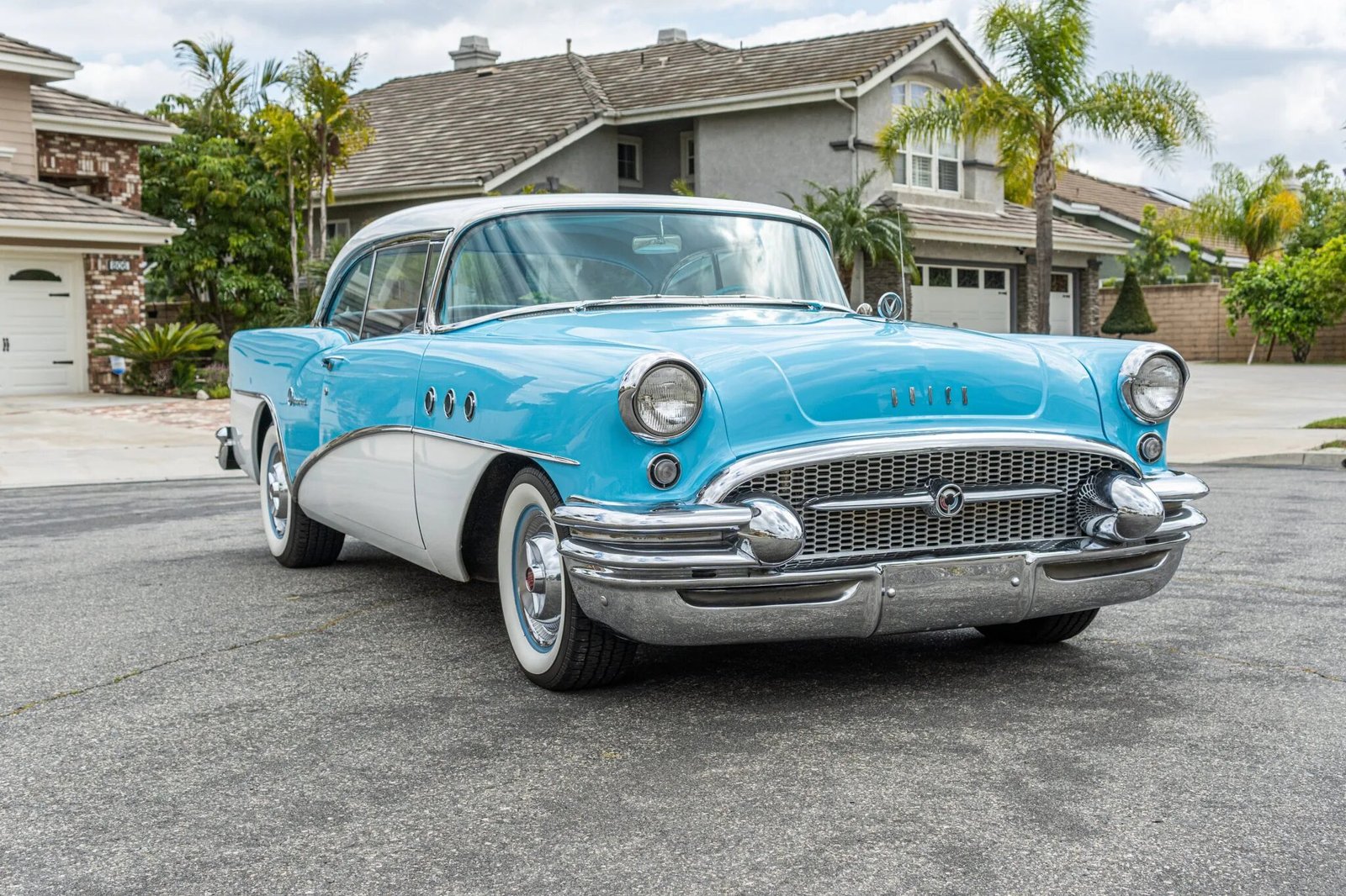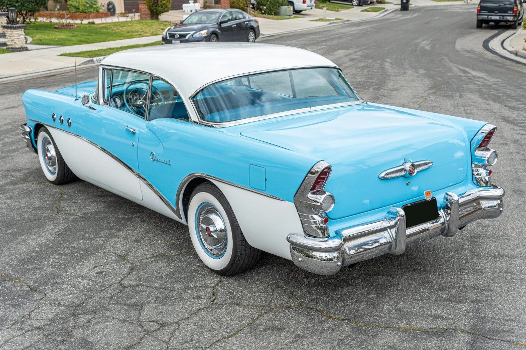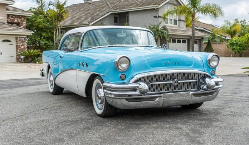 This 1955 Buick Special Riviera two-door hardtop is finished in blue with white accents over a matching interior and powered by a 502ci Ram Jet V8 paired with a Turbo 400 three-speed automatic transmission and a Currie 9-inch rear axle.