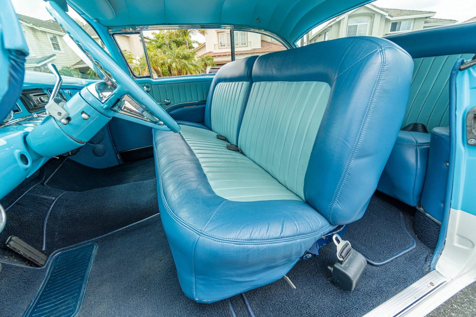 The cabin features front and rear bench seats reupholstered in blue vinyl with channeled white inserts joined by a matching dashboard, door panels, and carpets.