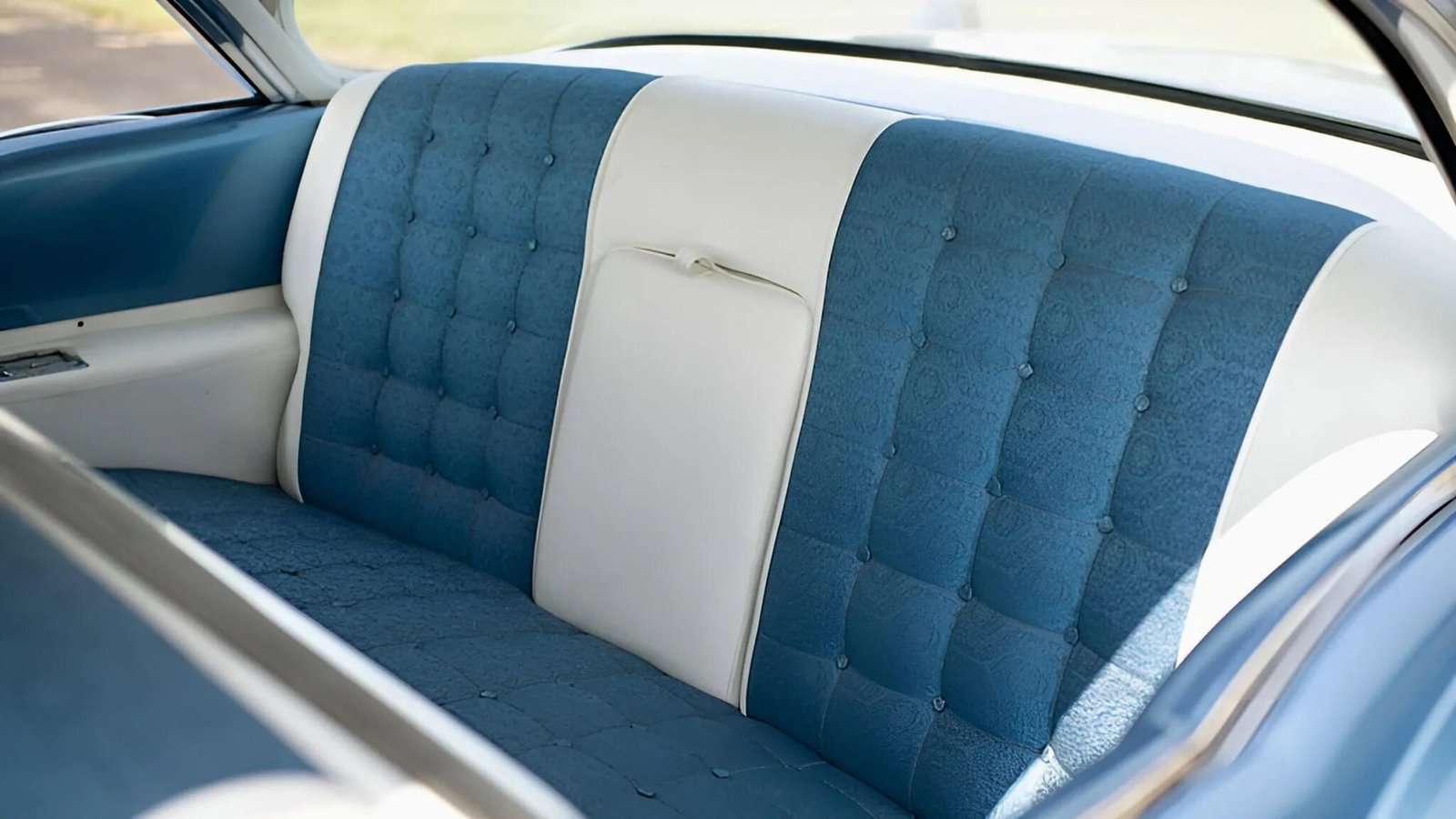 Replacement two-tone seat upholstery is accompanied by a color-coordinated padded dashboard and door panels accented with polished trim.