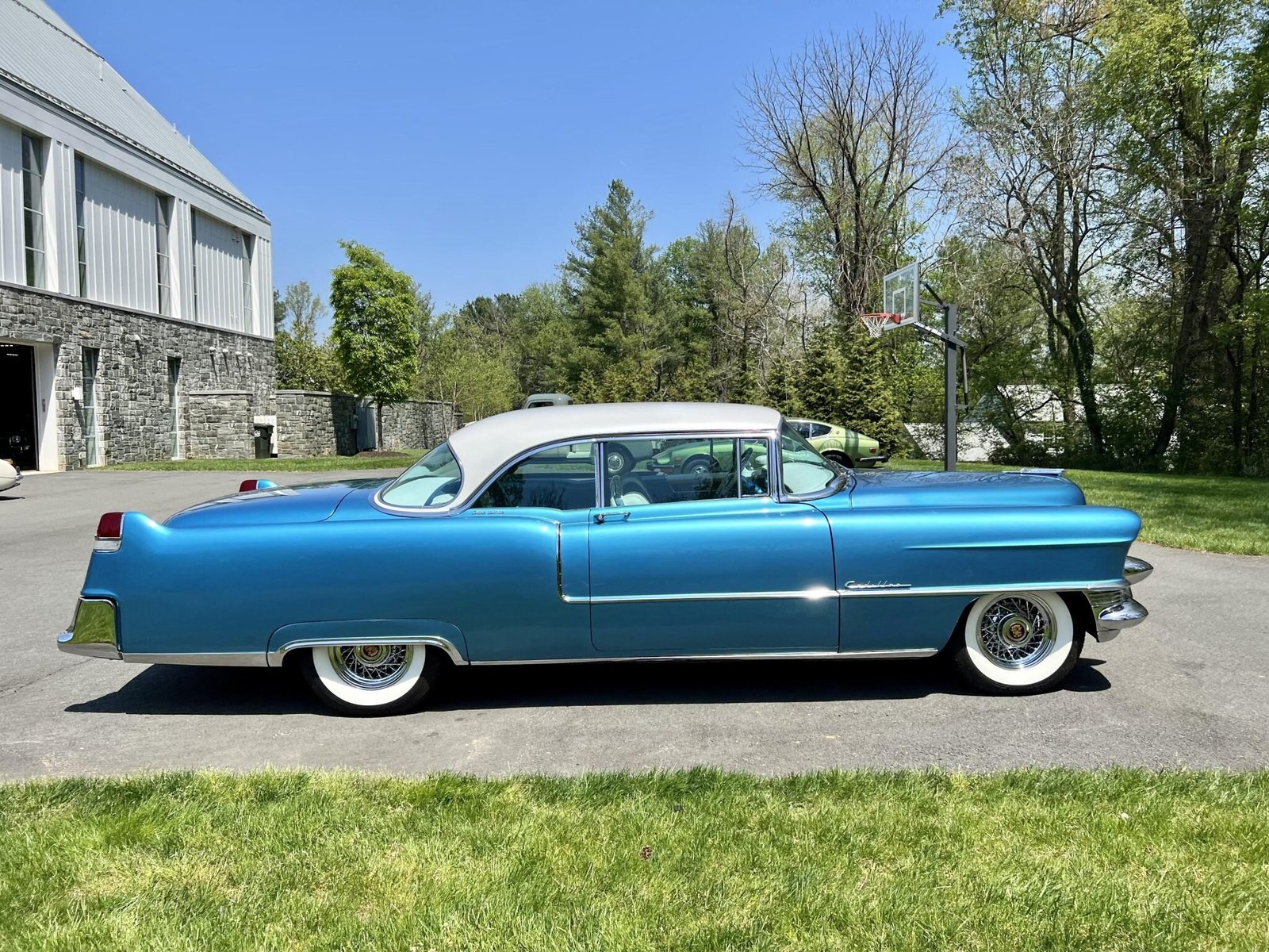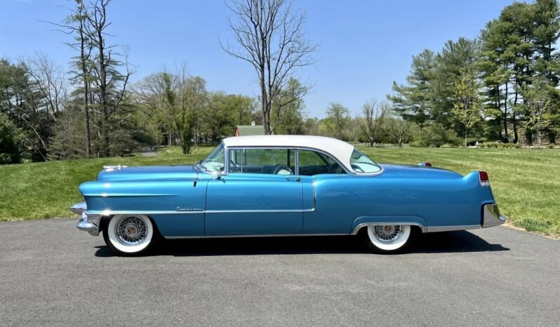 The car is finished in Bahama Blue Metallic and white over a two-tone interior, and it is equipped with a 331ci V8 paired with a Hydra-Matic four-speed automatic transmission.