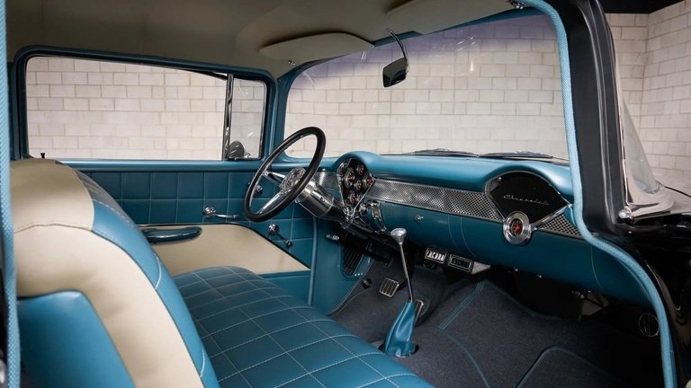 The cabin was reupholstered and features two-tone blue and white vinyl seats with matching door panels and gray squareweave carpets with blue edging.
