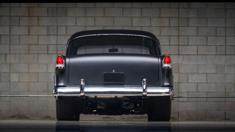 Finished from the factory in Skyline Blue and India Ivory (602), the car was stripped to bare metal and repainted black and matte gray by Poor Boys Hot Rods in the early 2010s following the completion of body work and rust repairs in the rockers, window channels, pillars, and other areas around the body.