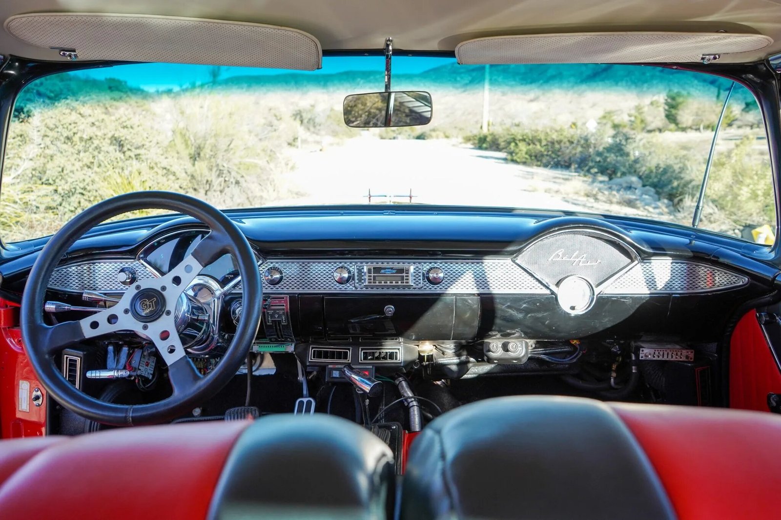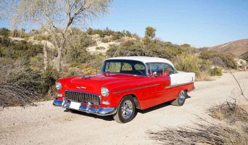 This 1955 Chevrolet two-door hardtop is finished in red and white over black and red and is powered by a replacement 502ci V8 paired with a Turbo 400 three-speed automatic transmission and a Gear Vendors overdrive.