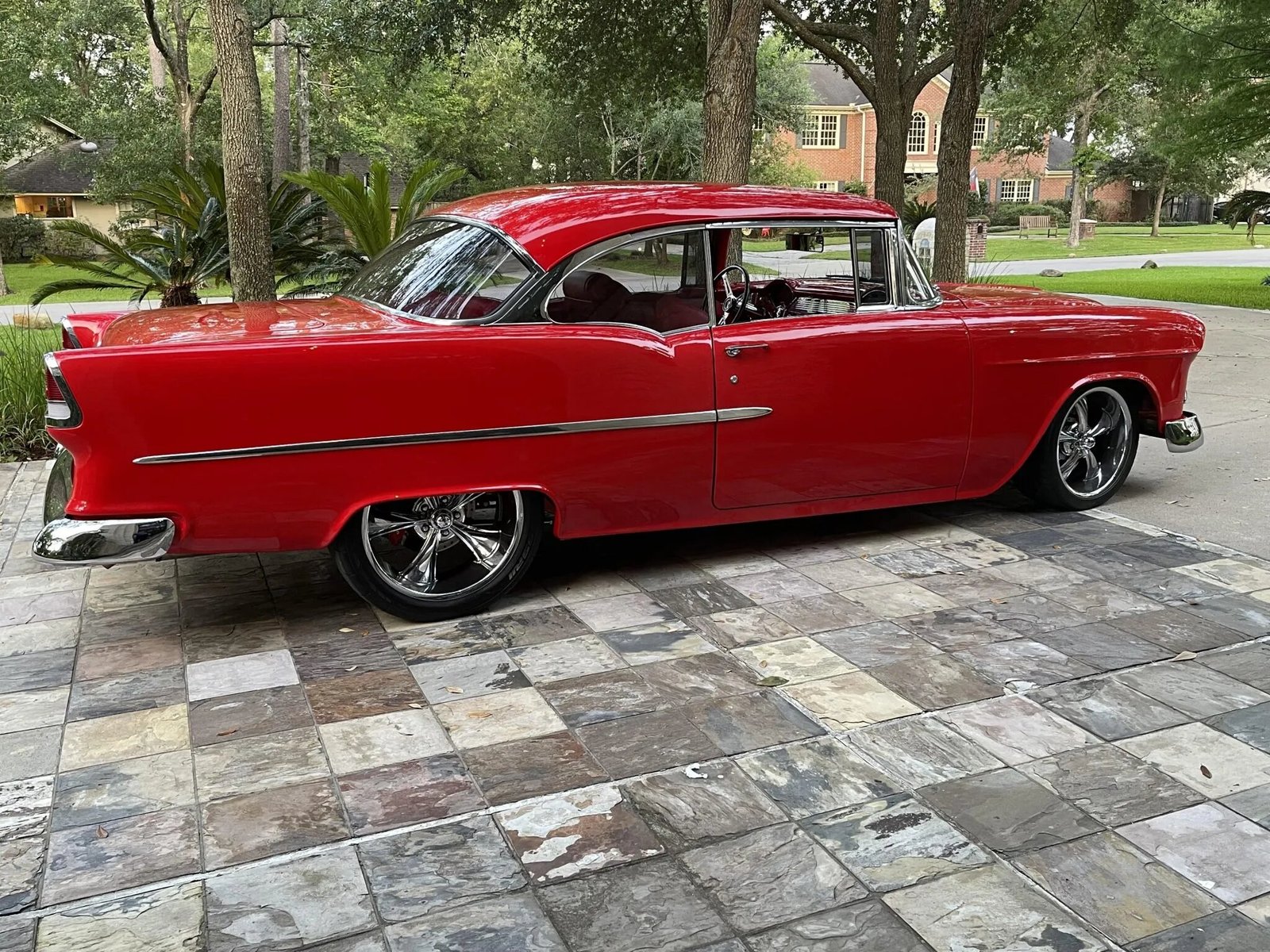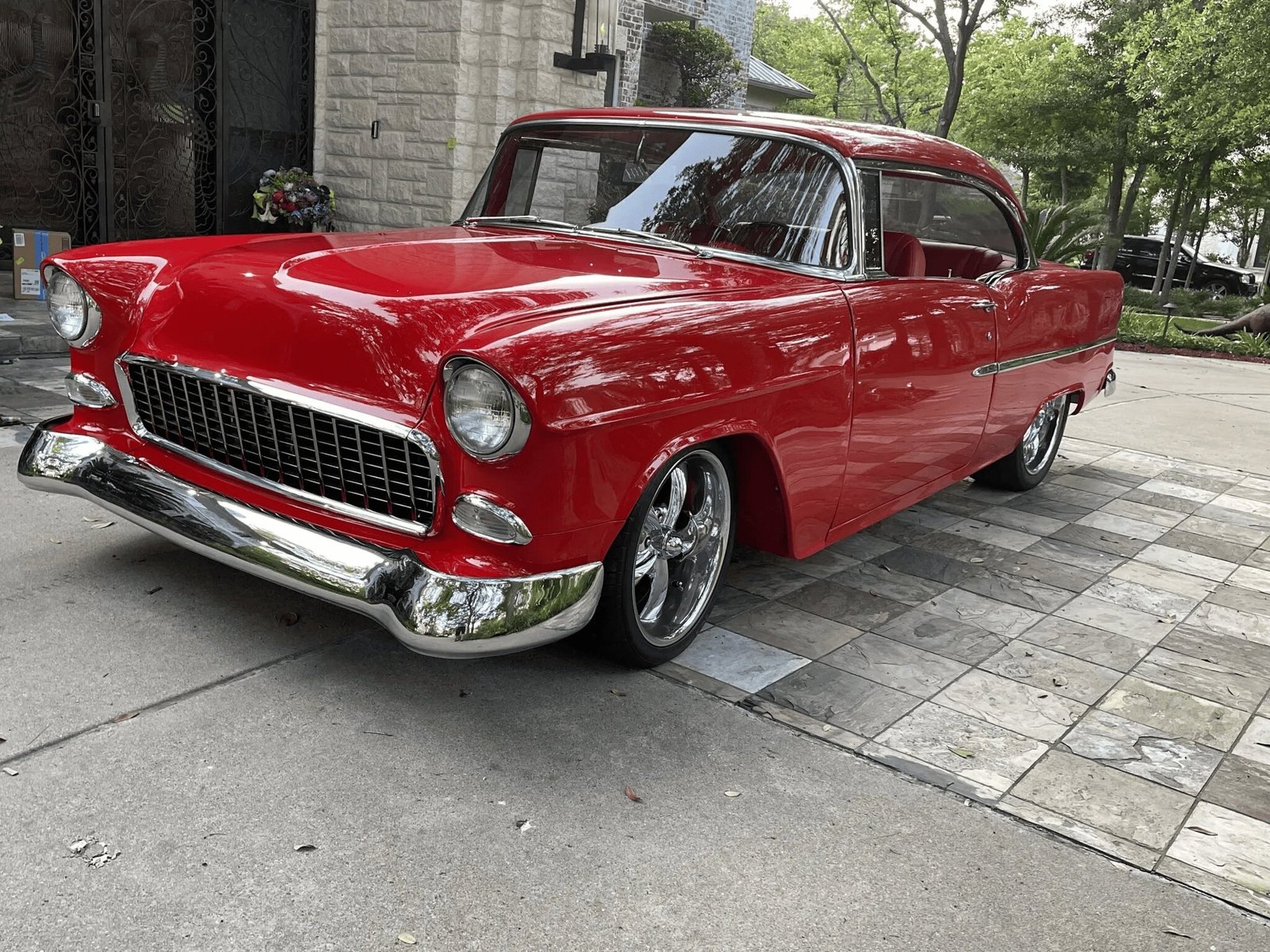 This 1955 Chevrolet two-door hardtop have been the subject of a three-year refurbishment and custom build. Finished in red over red leather upholstery, the car is powered by a supercharged 6.2-liter LSX376-B15 V8 mated to a GM 4L75-E four-speed automatic overdrive transmission. Additional equipment includes a 9″ Ford rear end with a 3.70:1 gear ratio, a 3″ stainless-steel exhaust system with MagnaFlow mufflers, an aluminum radiator, staggered-diameter Ridler wheels, four-wheel Wilwood disc brakes with an electronically-actuated master cylinder, a Vintage Air climate control system, Dakota Digital instrumentation, power windows and steering, and a hidden Bluetooth-capable stereo as well as chassis sourced from Fat Man Fabrications featuring front and rear adjustable coilovers, a four-link rear suspension setup, and polished suspension components.